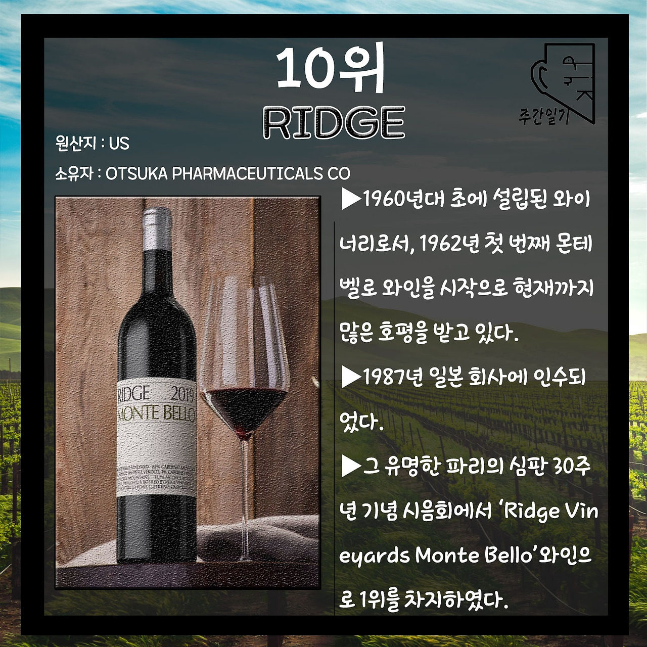 순위의 시작을 알리는 10위는 'RIDGE'이다. 와인을 좋아하는 사람들에겐 그리 생소하지만은 않을 수도 있는 이 브랜드는 1960년 초에 설립된 와이너리로서, 1962년 첫 몬테벨로 와인을 시작으로 현재까지 많은 호평을 받고 있다.