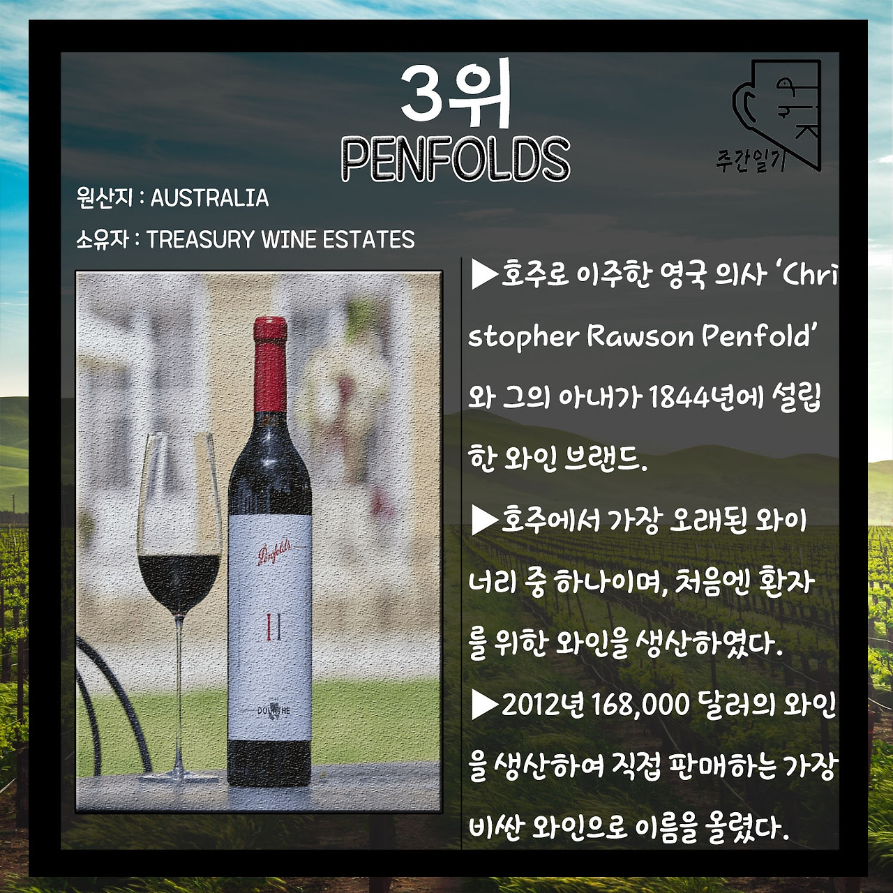 3위는 'PENFOLDS'이다. 호주로 이주한 영국 의사 'Christopher Rawson Penfold'와 그의 아내가 1844년에 설립한 와인 브랜드로서, 호주에서 가장 오래된 와이너리 중 하나이다.