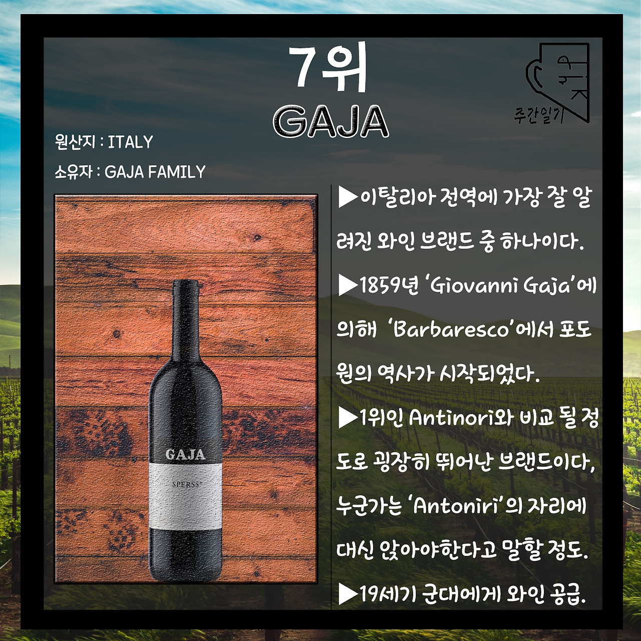 이어서 7번째로 뛰어난 와인 브랜드는 'GAJA'이다. 이탈리아 전역에 가장 잘 알려진 브랜드로서, 1859년 'Giovanni Gaja'에 의해 'Barbaresco'에서 역사가 시작되었다.