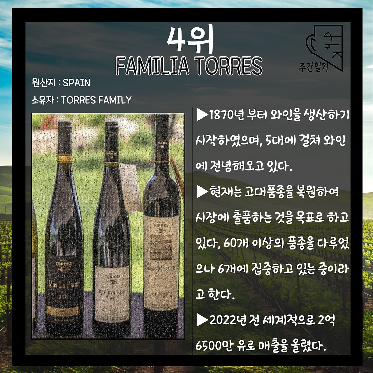 4위는 'FAMILIA TORRES'이다. 1870년부터 역사가 시작된 이 브랜드는 5대에 걸쳐 지금까지 와인에 전념해오고 있는 중이다.