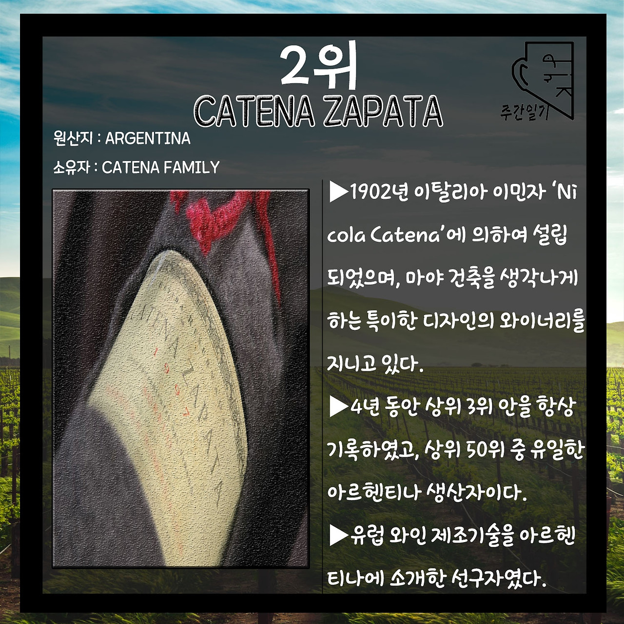 2위는 항상 굳건하게 상위 순위를 유지하는 'CATENA ZAPATA'이다. 1902년 이탈리아 이민자 'Nicola Catena'에 의하여 설립되었으며, 마야 건축을 생각나게 하는 특이한 디자인의 와이너리를 가지고 있다.