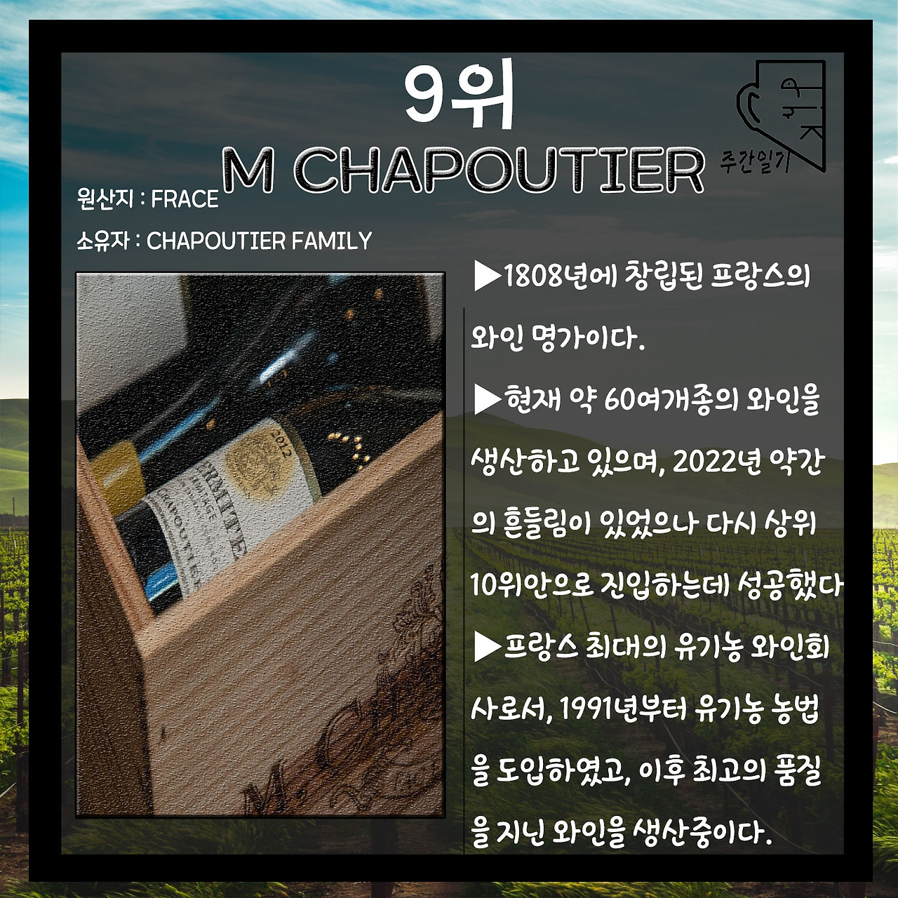 9위는 프랑스 출신의 브랜드 'M CHAPOUTIER'이다. 1808년 론 밸리에서 창립된 프랑스 와인의 명가이며, 현재 7대째 가업을 계승하고 있는 와이너리이다.