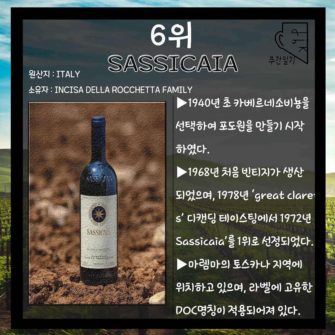 6위는 'Sassicaia'이다. 기본적으로 이름의 의미는 브랜드가 아닌 와인이지만, 'Tenuta San Guido'의 대표적인 와인으로서 너무나도 유명해진 탓에 브랜드 이름 대신 'Sassicaia'라고 부르는 경우가 오히려 많아졌다고 한다.