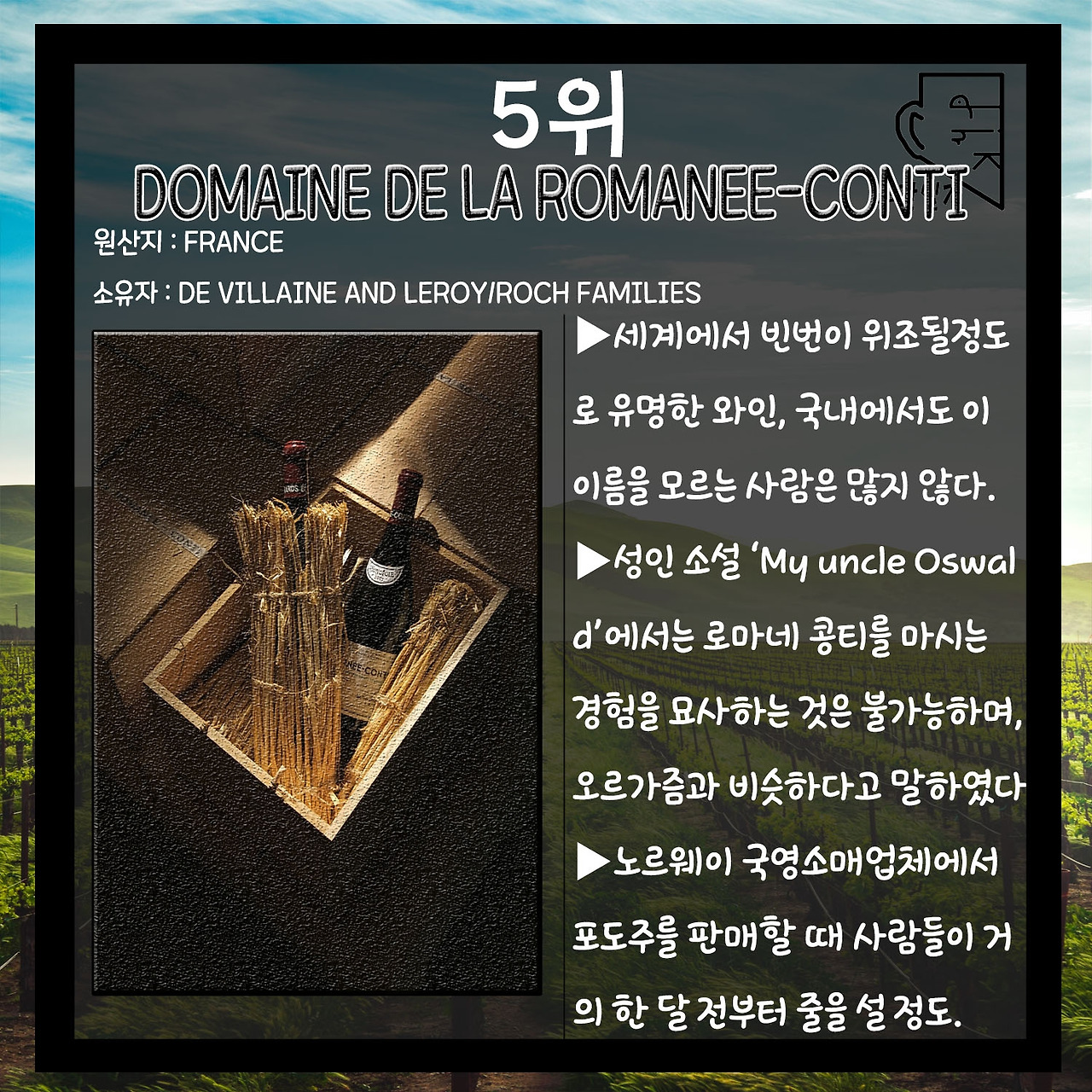 5위는 유명하고도 유명한 와인, 'DOMAINE DE LA ROMANEE-CONTI'이다. 세계최고의 와인 생산 브랜드로 널리 알려져 있으며, 프랑스에서 태어난 이 로마네 콩티는 없어서 구하지 못할 정도로 뛰어난 맛을 선보인다.
