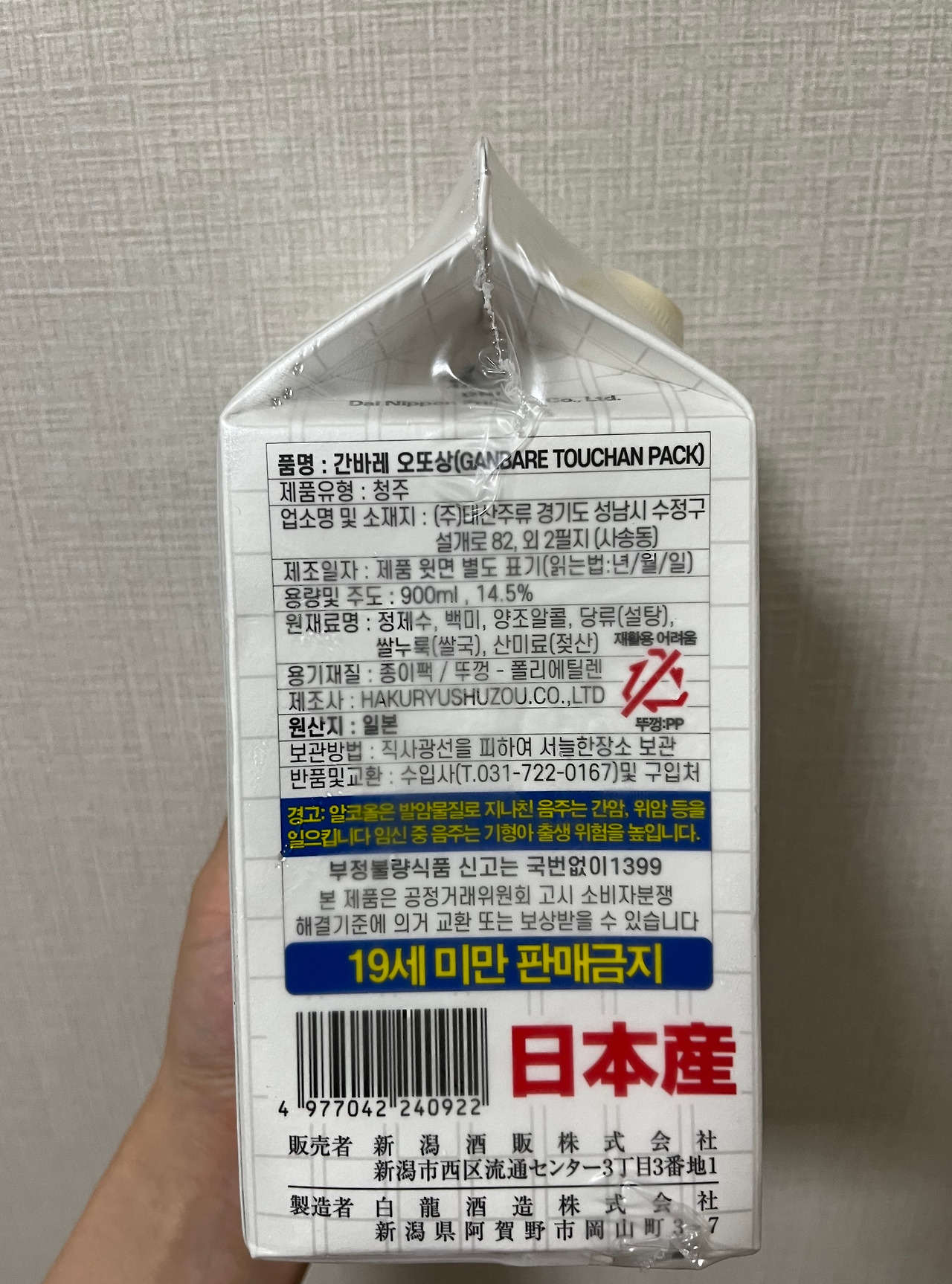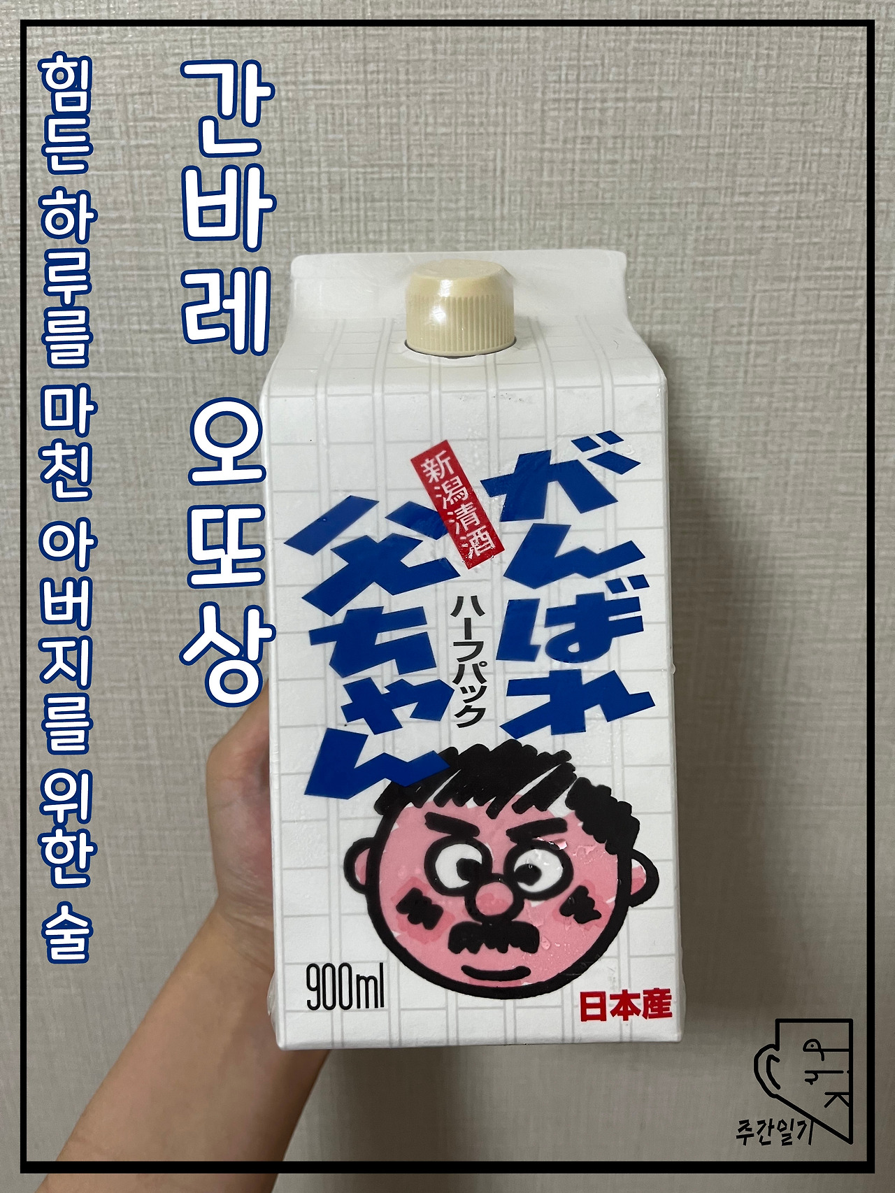 한눈에 보면 알 수 있듯이 병사케가 아닌 팩사케이다. 도수는 14.5도 이고 용량은 900ml, 혼자서 음주하기엔 살짝 많다고 느껴질 수 있으나 홀짝거려보니 생각보다 금방 사라지더라. 일본 내에서는 '간바레 토짱'이라는 이름으로 불리고 있으며, 수입을 하면서 '간바레 오또상'으로 등록하여 우리에겐 이 이름이 익숙한 상태가 되었다.