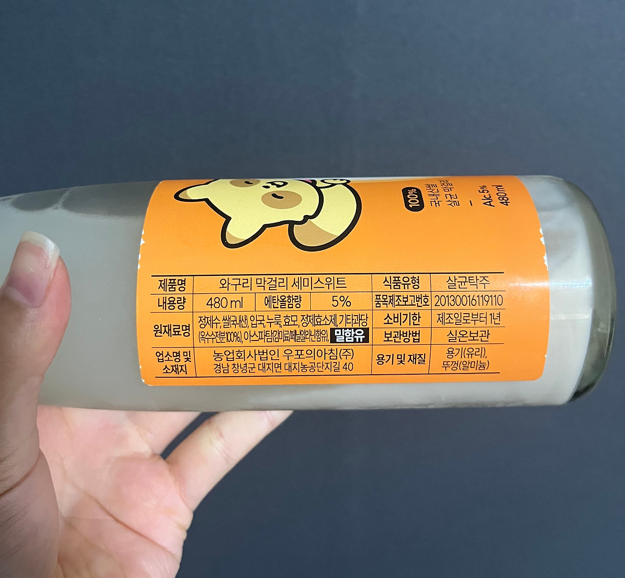 이 귀여운 술의 도수는 5도, 용량은 480ml, 거기에 가격은 5500원이다. 사람에 따라 약간 비싸다는 생각이 들 수도 있지만, 개인적으로 최근 출시되는 막걸리의 가격들을 생각해 보면 그리 고가는 아니라고 생각된다. 적당함, 혹은 살짝 높은 정도. 여하튼 한 병을 사 먹기에 부담되는 가격은 아니다.