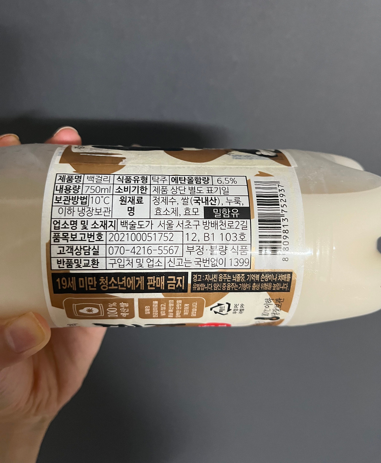 이 백사장님이 출시한 술의 용량은 750ML, 도수는 6도이며, 가격은 4500원이다. 예상보단 살짝 비싸다는 느낌이 있다. 물론 최근 출시되는 막걸리나 전통주의 가격과 비교해 본다면 오히려 싼 편이지만, 편의점에 자리 잡고 있는 주변 막걸리들의 가격이 한몫하는 것 같다.