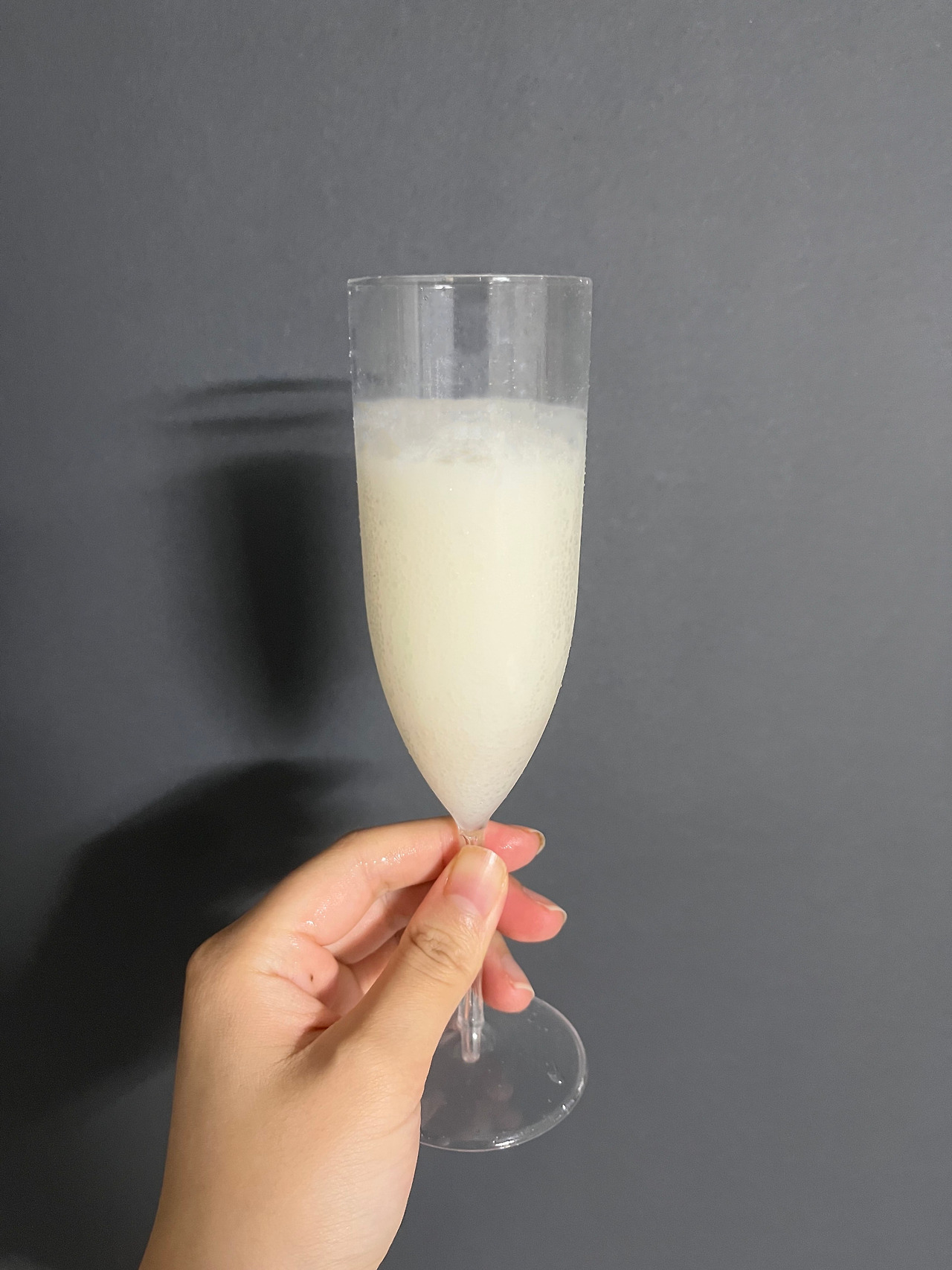 잔에 따른 막걸리는 약간 진한 우유색깔을 보여준다. 윗부분에는 기포가 옹기종기 모여 보기 좋게 거품을 이루고, 왠지 모르게 시원한 탄산감을 보여 줄 것 같은 기미를 보인다.