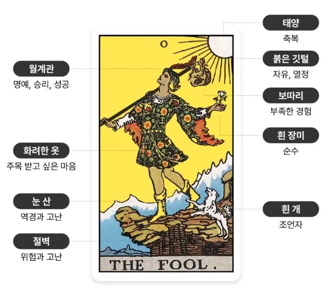 기본적으로 바보카드는 자유로운 순수함을 의미하는데요. 이를 긍정적인 방향으로 해석하면 새롭게 무언가를 시작한다는 의미고 부정적인 방향으로 해석하면 경험이 부족해 실패할 가능성이 높다는 해석이 가능해요.