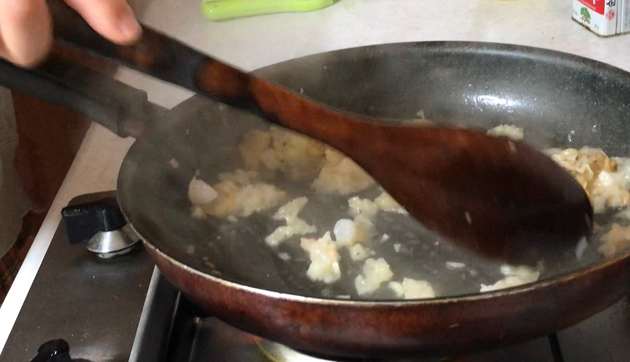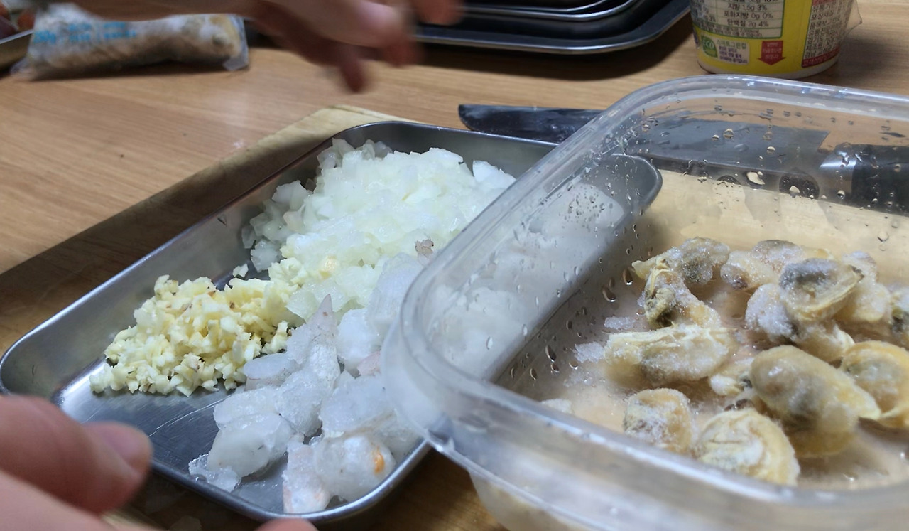 볶음채소 : (양파 1/4개 . 마늘 2개 . 새우 4 마리 , 조갯살 10개)