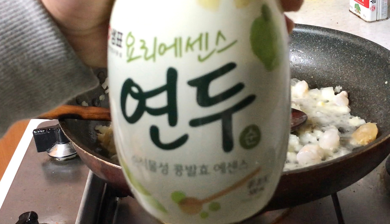 팬을 뒤집어주면서 흔들어 기름과 물과 면의 전분기가 섞이게 도와준다.