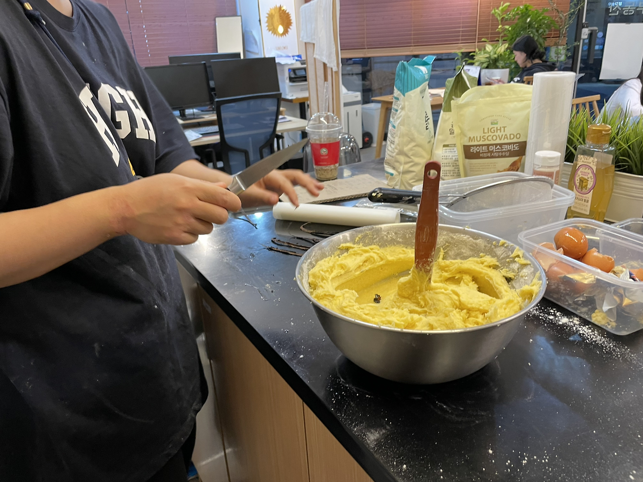 민경친구와 주환제자는 베이킹을 한다. 계량을 한다. 썩좋은 환경은 아니다. 저울도 하나요. 볼도 제각각이요. 재료는 사방팔방에 퍼져있고, 어쨋든 그렇다. 그럼에도 하나씩 준비해간다.