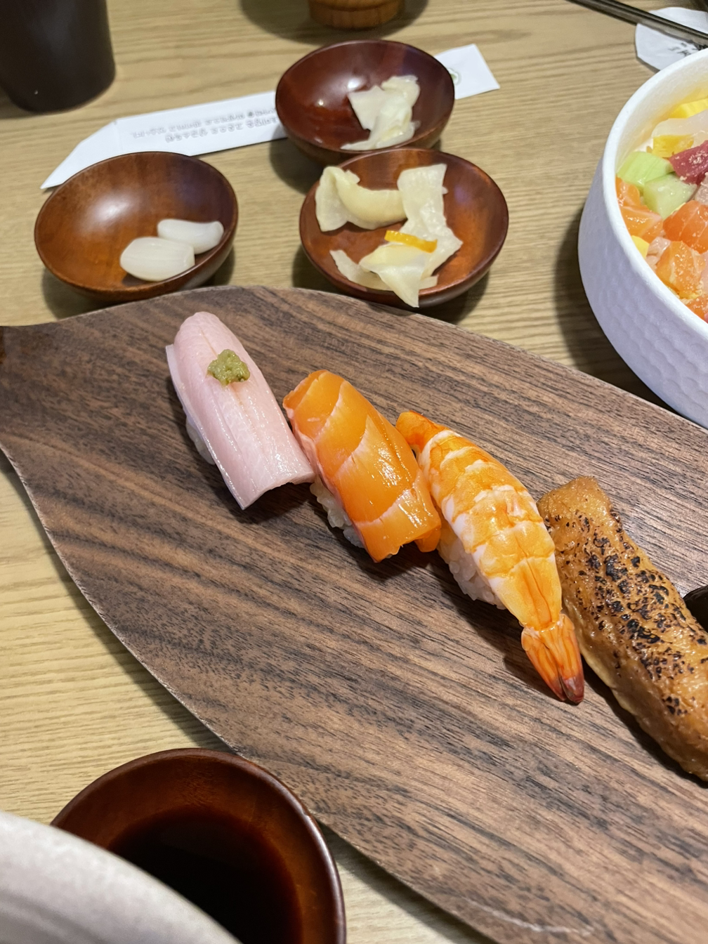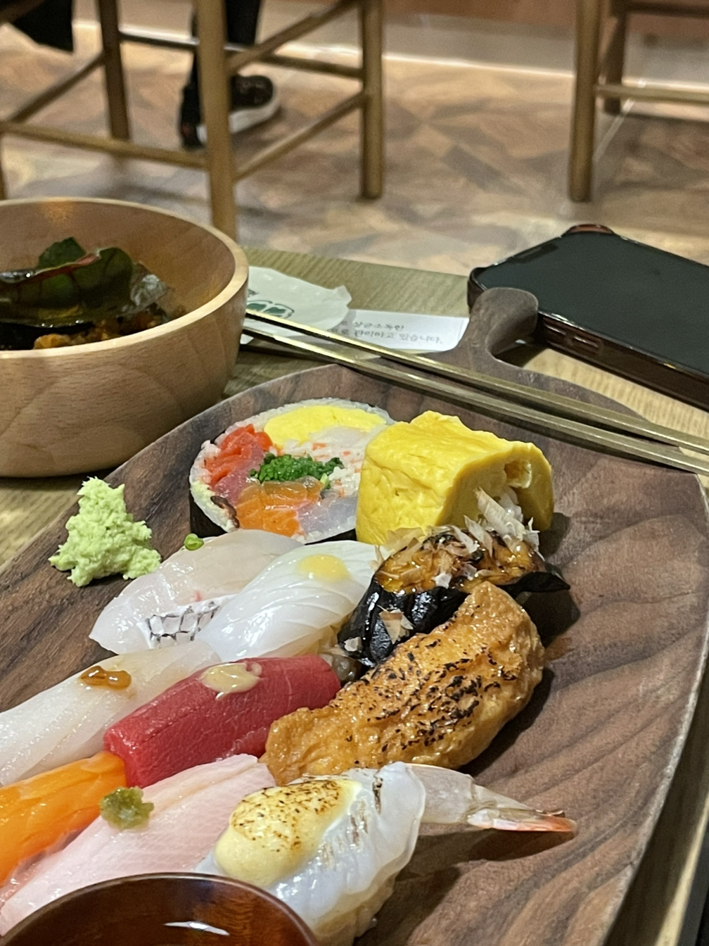 둘 중 하나가 다르면 참 다른 경험이 된다. 아마 이 초밥집을 여자친구와 왔다면 (없지만...) 또 달랐을 것이다. 인테리어 사진은 찍었겠지만, 찍고 인테리어로만 2시간 이야기하지는 않았을 것이다. 아마 초밥을 보며 먹는 샷을 찍으며 아마 내 갤러리에 '1년 전 그날'이라는 말과 함께 어여쁜 사진이 있었겠지만, 오늘은 아쉽게도 인물사진이 없다. (쓰고 보니 진짜 그랬다.)