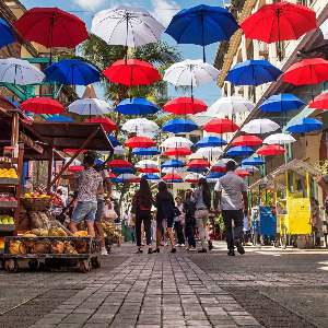 포트 루이스 중심부에는 인증숏 필수 코스인 화려한 우산이 매달려 있는 우산 거리를 빠트릴 수 없습니다. 바람에 흔들리는 파도와 햇빛에 빛나는 우산이 완벽하게 정렬되어 거리가 무척 화려합니다. 차광막 대신 머리 위로 놀라운 캐노피를 만드는 놀랍도록 다채로운 색상의 우산으로 장식된 이 광장은 관광객과 현지인 모두의 관심을 끌며 기억에 남는 사진을 찍을 수 있는 이상적인 배경을 제공하고 있습니다. 우산 색상은 시기에 따라 달라진다고 합니다. 다양한 색상들의 우산을 조화롭게 매다는 것이 바로 포트 루이스의 다양성, 다문화 포용성을 상징하는 것이라고 생각이 됩니다.