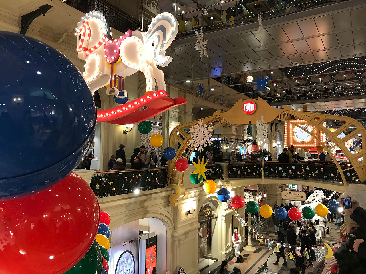 상점들은 경쟁하듯 트리를 꾸미는데, 특히 굼(ГУМ)으로 들어가면 그것을 모아서 볼 수 있다.