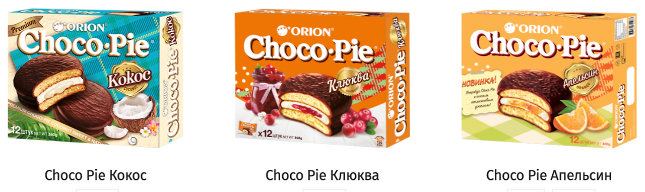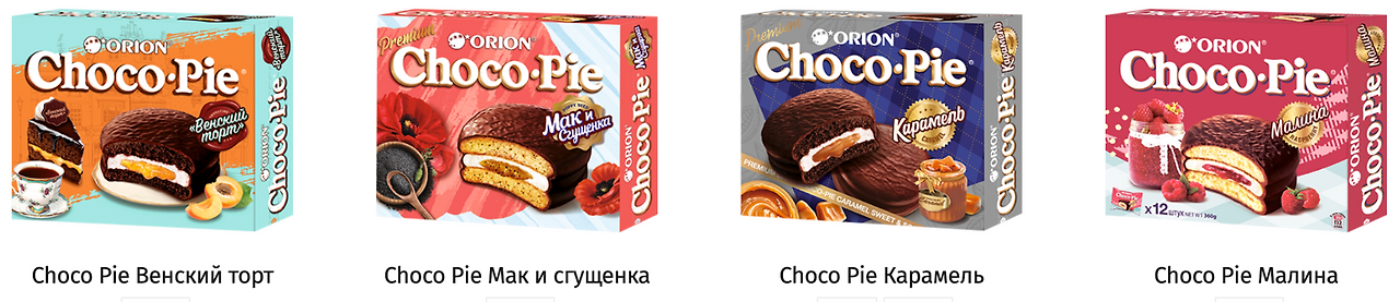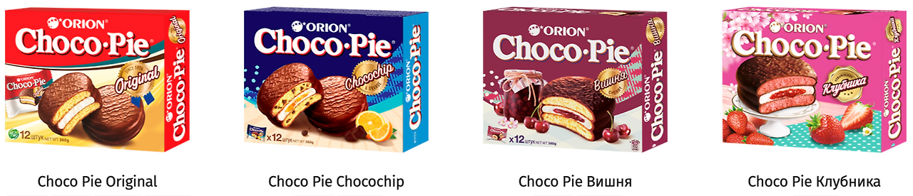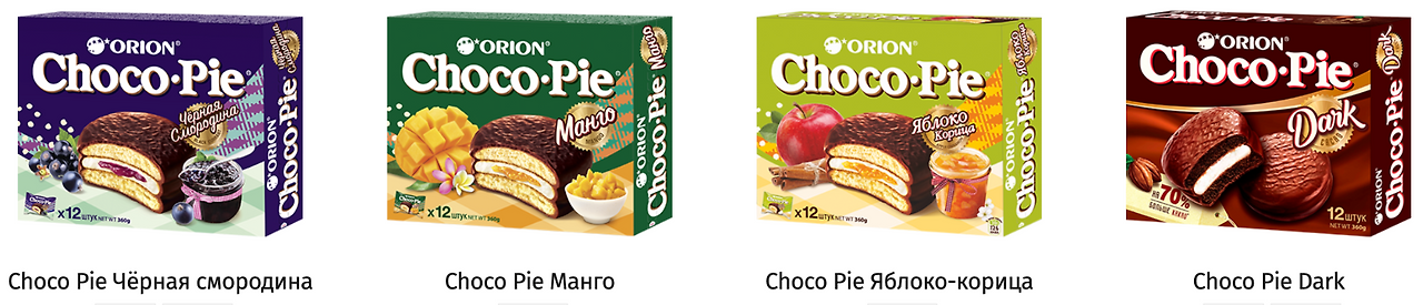 한국에서도 바나나맛, 딸기맛, 수박맛과 같은 제품을 볼 수 있는데, 러시아 지역에서는 현재 기준으로 오리온 초코파이 제품 종류가 15가지에 달한다.