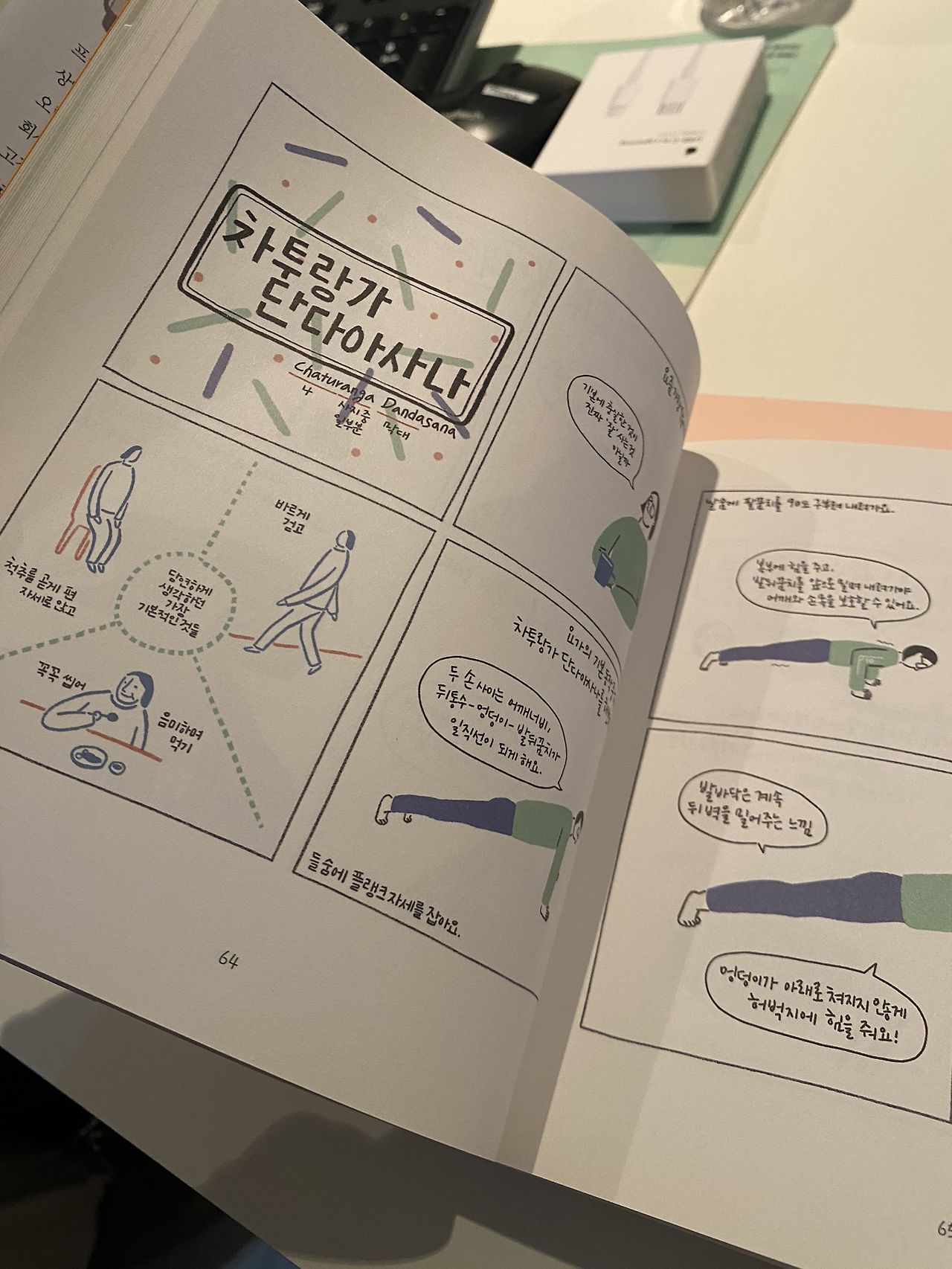 아쉬탕가에서 특히 자주 나오는 동작은 바로 ‘차투랑가 단다 아사나’ - 산스크리트어로 차투랑가는 사지, 단다는 막대를 의미한다고 한다. 플랭크 + 팔 굽혀 펴기가 믹스된 자세로 보면 된다. 쉬운 동작 같지만, 전신 근육을 써야 올바른 자세가 나오다 보니 막상 해보면 쉽지 않다. 요가 수련 초기엔 내가 할 수 없는 동작이라 단정 지었다. 일단 팔 굽혀 펴기를 못하던 때라서 팔이 내 몸의 무게를 2초도 버티지 못했다. 그렇지만 자주 나오는 자세인 만큼 정복해보고 싶어서 온몸을 바들바들 떨어가며 동작에 도전했다.