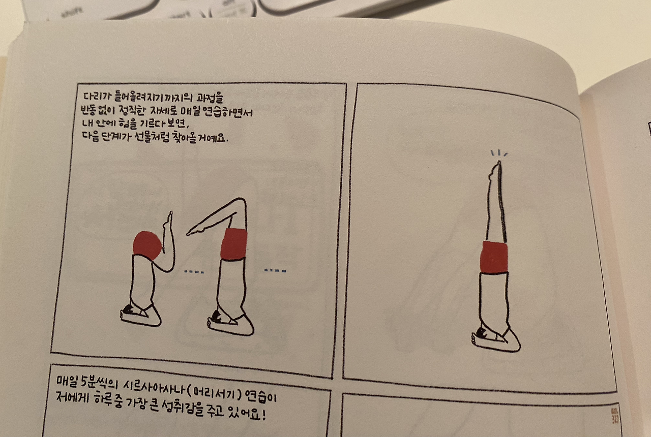 언젠가는 꼭 요가 아사나의 꽃 ‘머리 서기’ 자세를 성공해보고 싶다. 소위 그랜절이라고도 부르는데, 이건 견뎌본다고 될 수 있는 자세인지는 의심스럽다. 그래도 이왕 요가를 꾸준히 배우는 김에 꼭 한 번 성공해보고 싶다. 욕심내지 않고 단계별로 견디다 보면 코어가 강해지고 다리도 하늘 위로 뻗을 수 있는 날이 오겠지..?