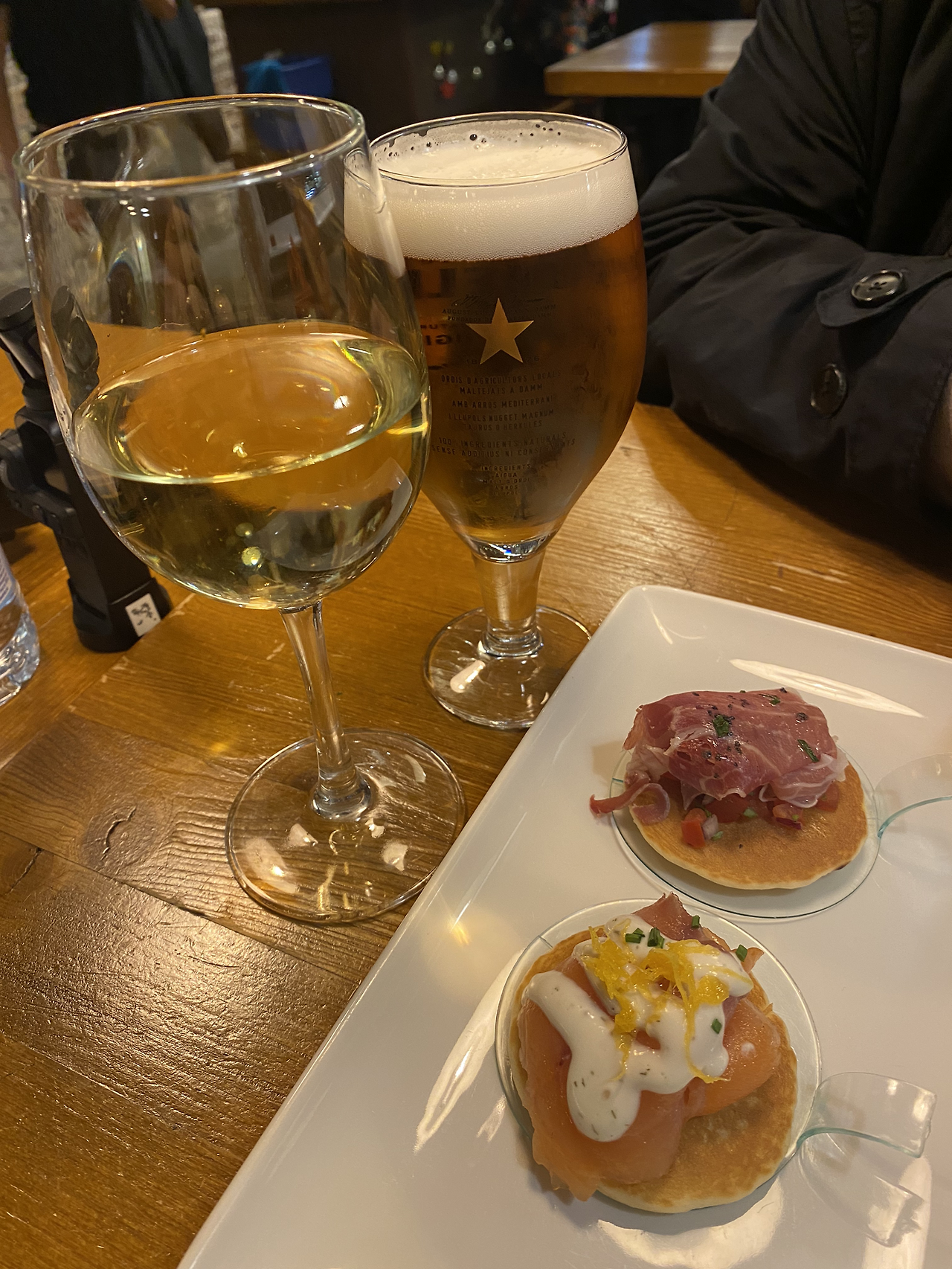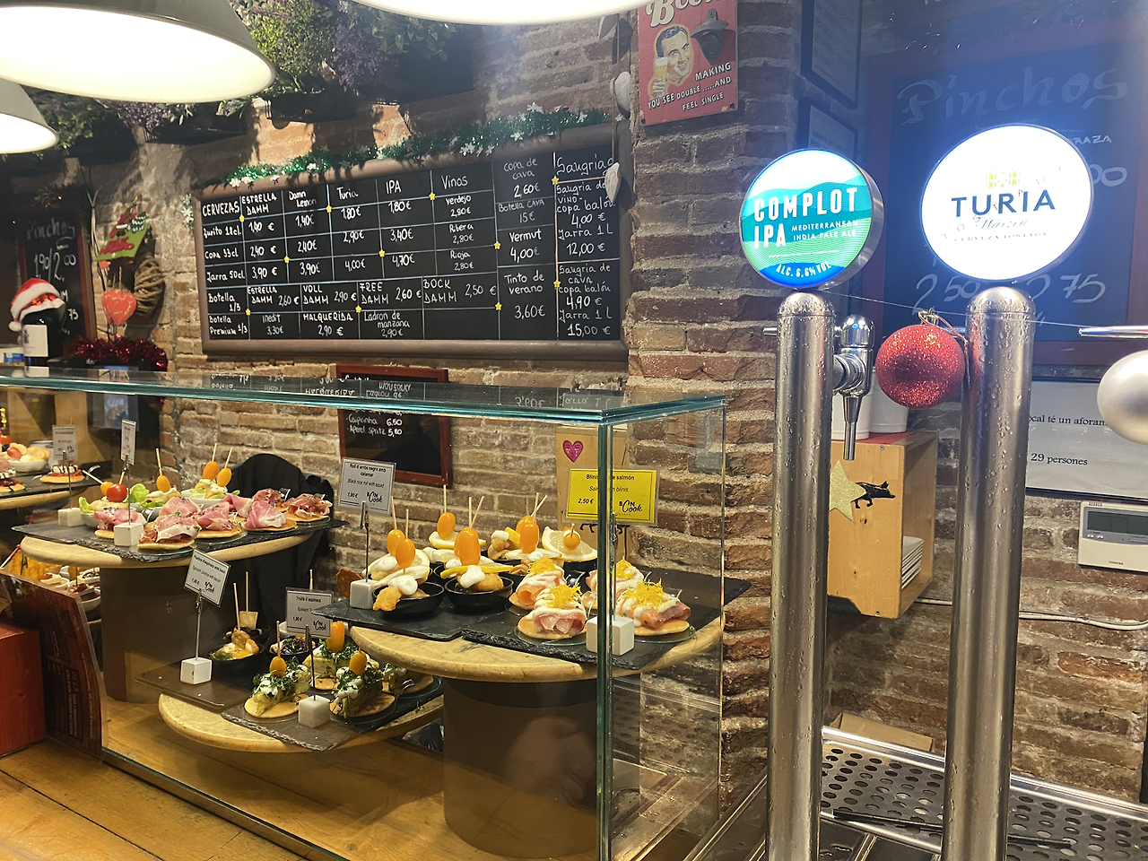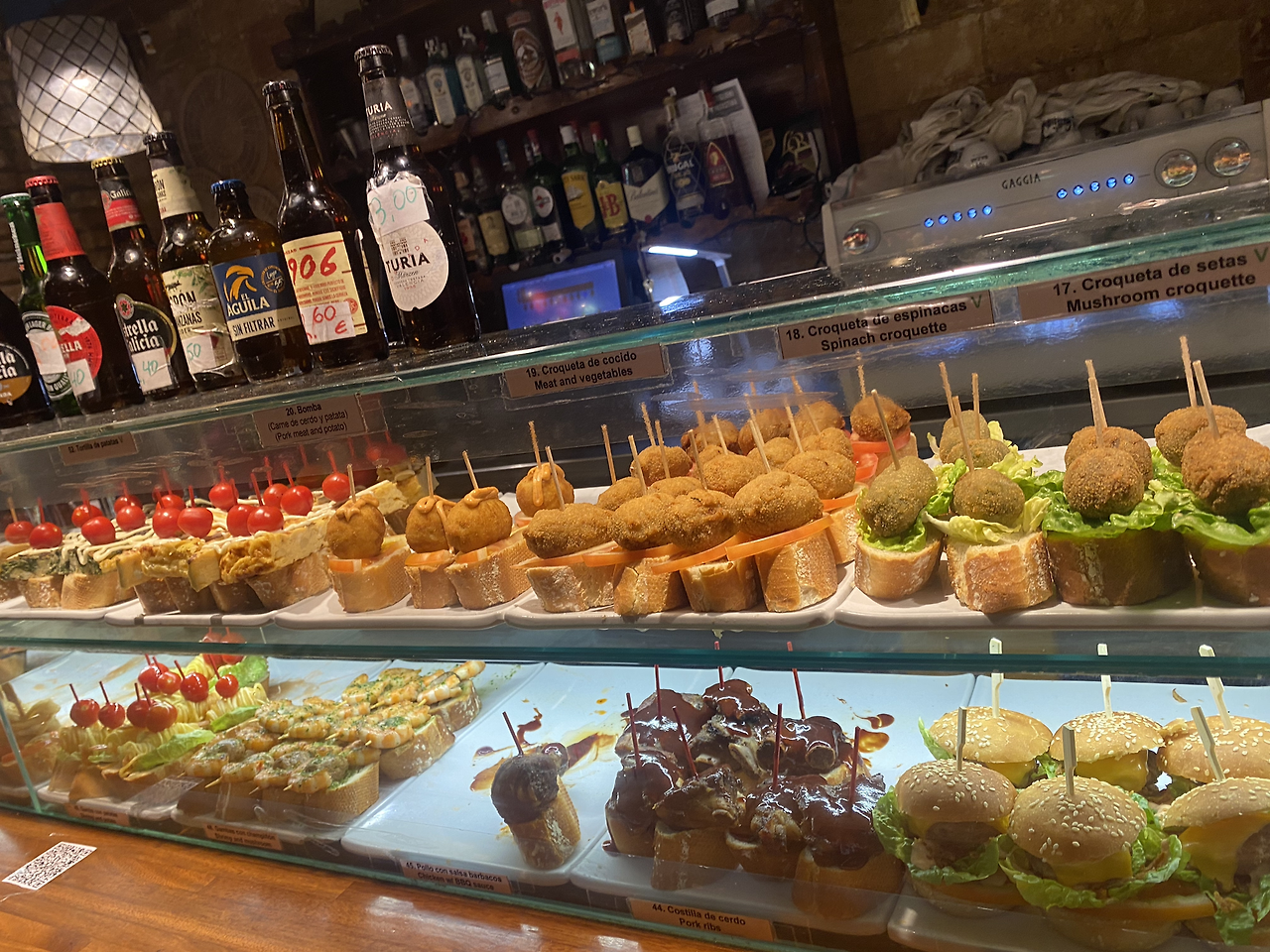 저녁은 핀초스거리를 투어 했다. 빵 위에 다양한 재료를 올려 꼬치로 꽂은 한입거리 요기음식인데, 이 집 저 집에서 조금씩 먹고 이동하는 투어가 백미다.