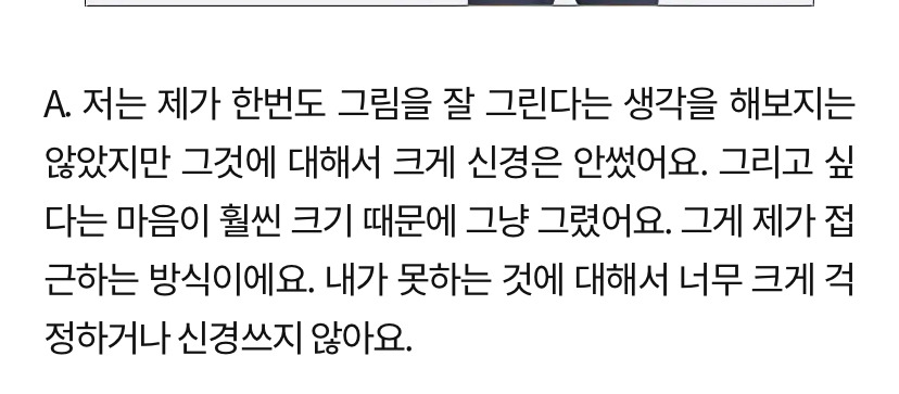 오늘 보고 온 장줄리앙 전시가 인상 깊어서 찾아본 인터뷰 중 굉장히 큰 힘이 되는 한 문장을 읽었다. 글쓰기에도 이런 태도를 적용한다면, 나는 올해 조금 더 즐겁게 글쓰기를지속할 수 있을 것 같다.