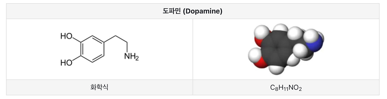 도파민(Dopamine)은 중추신경계에 존재하는 신경전달물질의 일종으로, 아드레날린과 노르아드레날린의 전구체이다 -위키백과-