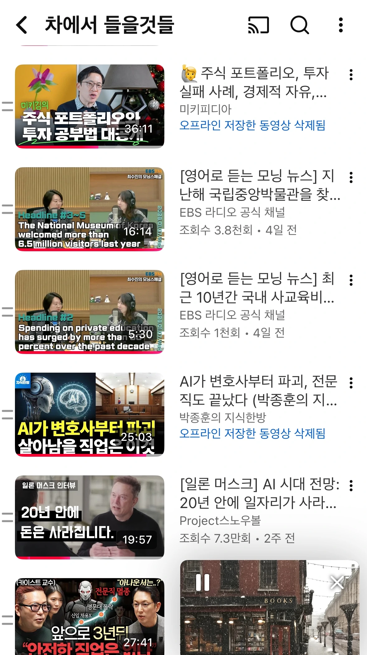 요즘도 나는 송도-여의도까지 차로 편도 1시간 반 거리를 오간다. 외근을 다니면 차에서 보내는 시간은 더 길어진다. 대중교통을 탈 때보다 무언가를 할 수 있는 제약이 더 생긴다. 그렇지만 언젠가부터 이 시간을 그냥 허비하기는 아깝다는 생각이 들었다. 회사에 가기 위해 ‘운전하는 시간’이라 생각하면 힘들지만, 무언가를 ‘들을 수 있는 시간’으로 생각을 전환하면 그 시간을 채울 수 있는 콘텐츠는 무궁무진했다. 라디오, 팟캐스트, 세상 돌아가는 뉴스, 영어 듣기 등등.. 지식을 충전하기에는 최적의 시간이다. 요즘은 출퇴근 시간을 움직이는 서재에서 보내는 기분이다.