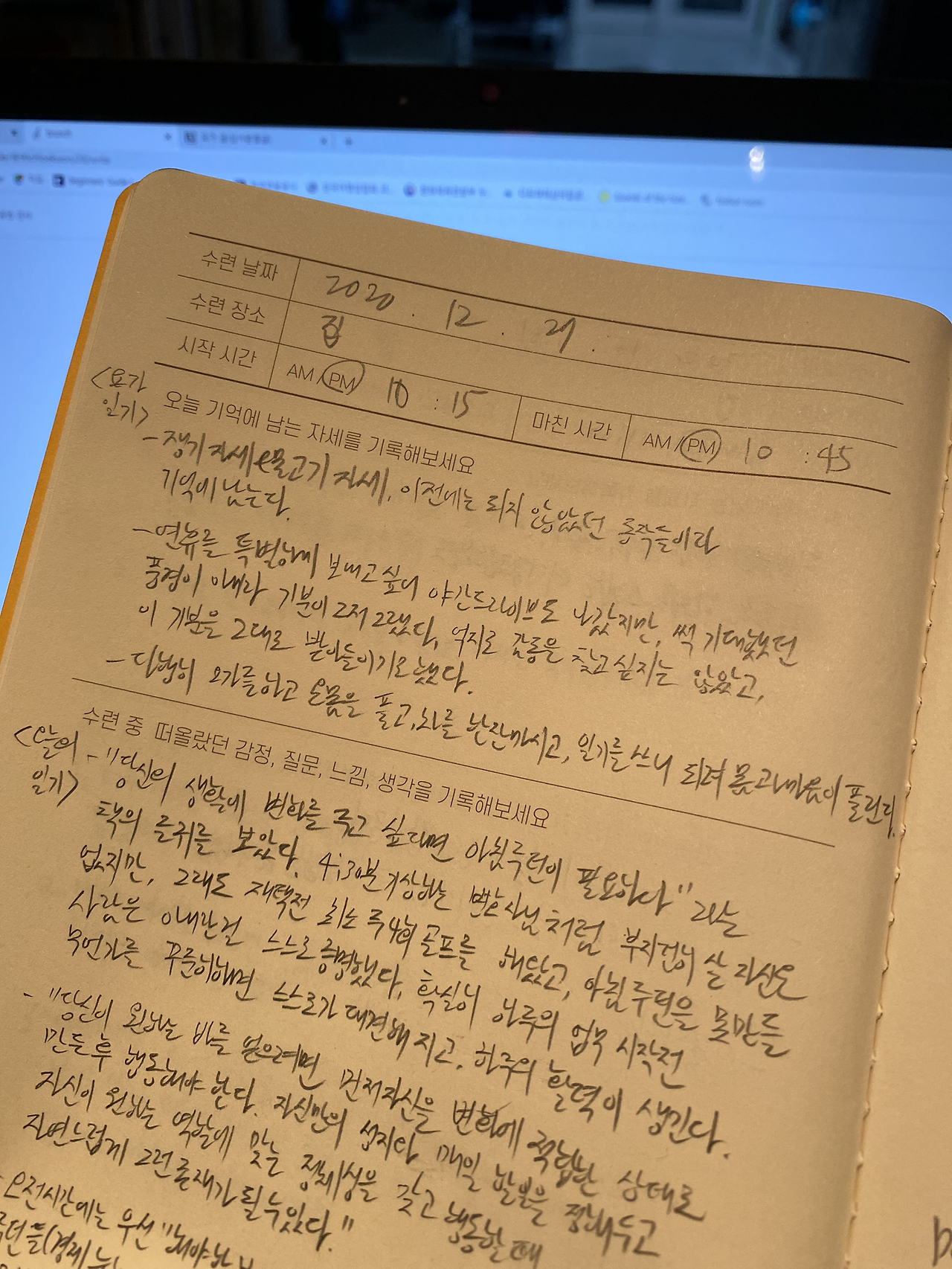 정확히 2020년 12월 27일. 기상하자마자 요가를 시작했고, 밑미 요가 노트에 짧은 기록들을 남기기 시작했다. 다행히 이 글을 쓰고 있는 5월 14일까지 요가루틴은 이어져오고 있다. 솔직히말해 하루도 안빼먹고 한 주는 한번도 없다. 술먹고 다음날 숙취에 시달리며 수련을 거르기도했고, 알람을 10번이나 맞췄으나 잠을 깨는데 실패해서 허겁지겁 출근한적이 한두번이 아니다. 드라마틱하게 몸에 변화가 있거나, 눈에 띄게 유연해졌다거나, 요가 자격증을 따고 싶을만큼 몸에 익거나 하진 않다. 여전히 아침에 일어날때 힘들고, 일주일에 한두번은 거르기도하고, 하는 내내 잡생각이 든다. 여기 까지 읽으면 ‘요가 제대로 한거 맞아?’라는 생각이 들 수도 있다.