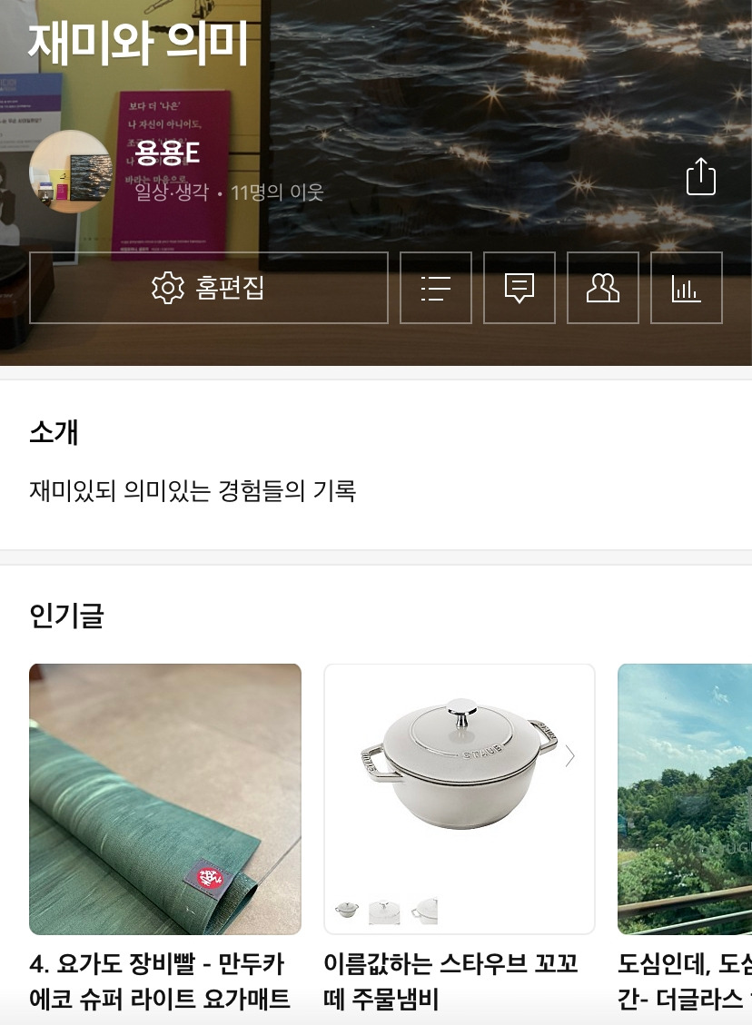 나는 그럼 어떤 사이드 프로젝트를 하고 있을까? 우선 글쓰기. 글로 밥벌이는 다음 생애나 할 수 있는 일 같아도, 연연하지 않고 일단 꾸준히 진지하게 ‘일단 해보는’ 중이다. 이렇게 브런치에 글감을 찾고, 글의 구성을 기획하고, 비슷한 주제들을 묶어 매거진도 만들고 있다. 블로그에는 다른 성격의 글(주로 정보성 콘텐츠)을 일주일에 1-2회 올리며 다양한 플랫폼의 성격도 배워가는 중이다. 가끔은 브이로그나 여행 영상을 만들어 영상 콘텐츠의 문법도 알아가고 있다.