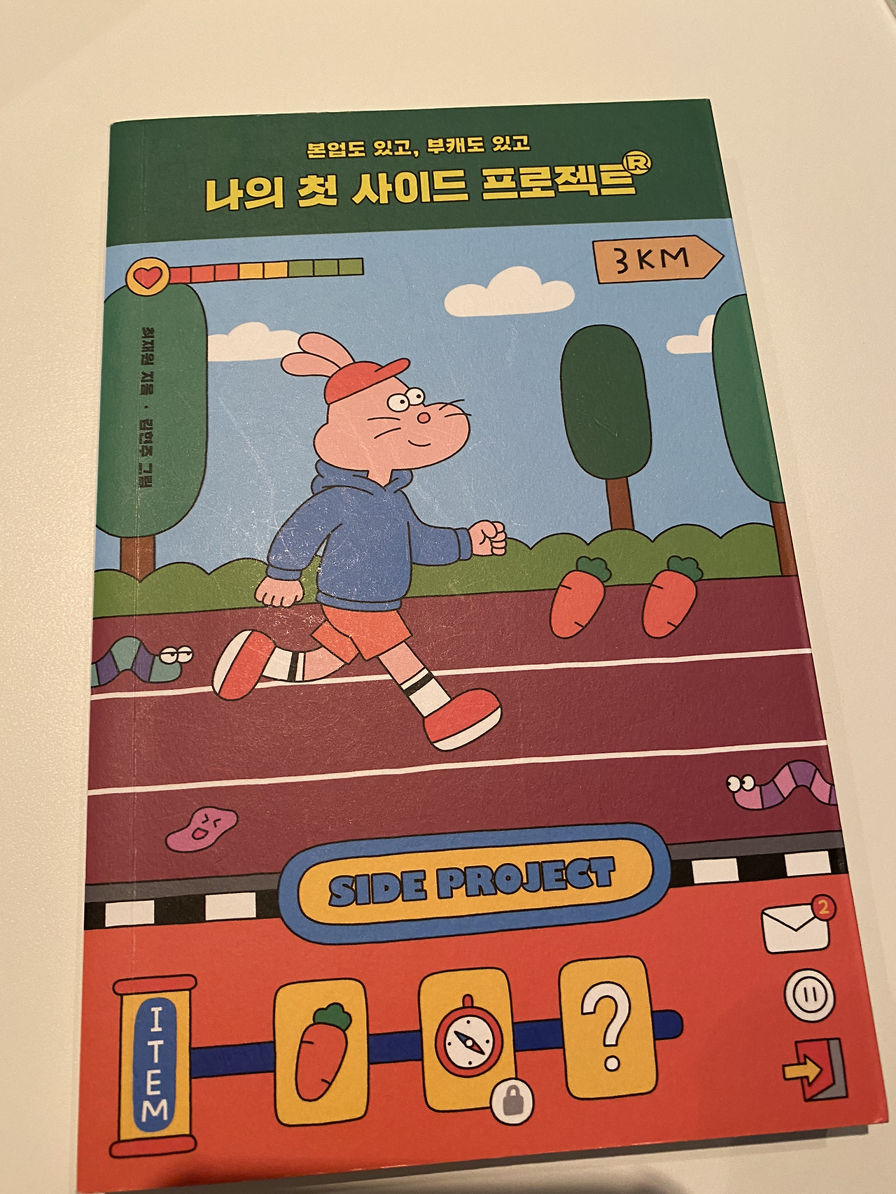 [나의 첫 사이드 프로젝트, 최재원 지음/ 김현주 그림]라는 책은 본격적으로 내가 사이드 프로젝트를 시작하기 전 길잡이가 되어 준 책이다. 이 책을 통해 사이드 프로젝트에 대한 부담감과 오해를 덜어낼 수 있었다. 사실, 책을 접하기 전까지는 단기간 내에 현재 내 본업 외에 다른 분야에서 결과물을 내고, 경제적 수익을 얻고 싶다는 조바심이 났다. 하루빨리 직장인에서 벗어나 직업인이 되고 싶었다. 달리기에 비유하자면, 고작 5KM 뛰는 러너인 내가 42.195KM를 욕심내고 있는 것과 마찬가지인 셈이다. 그건, 사이드 프로젝트라기 보단, N 잡러, 부업을 하고 싶다고 봐야 한다.