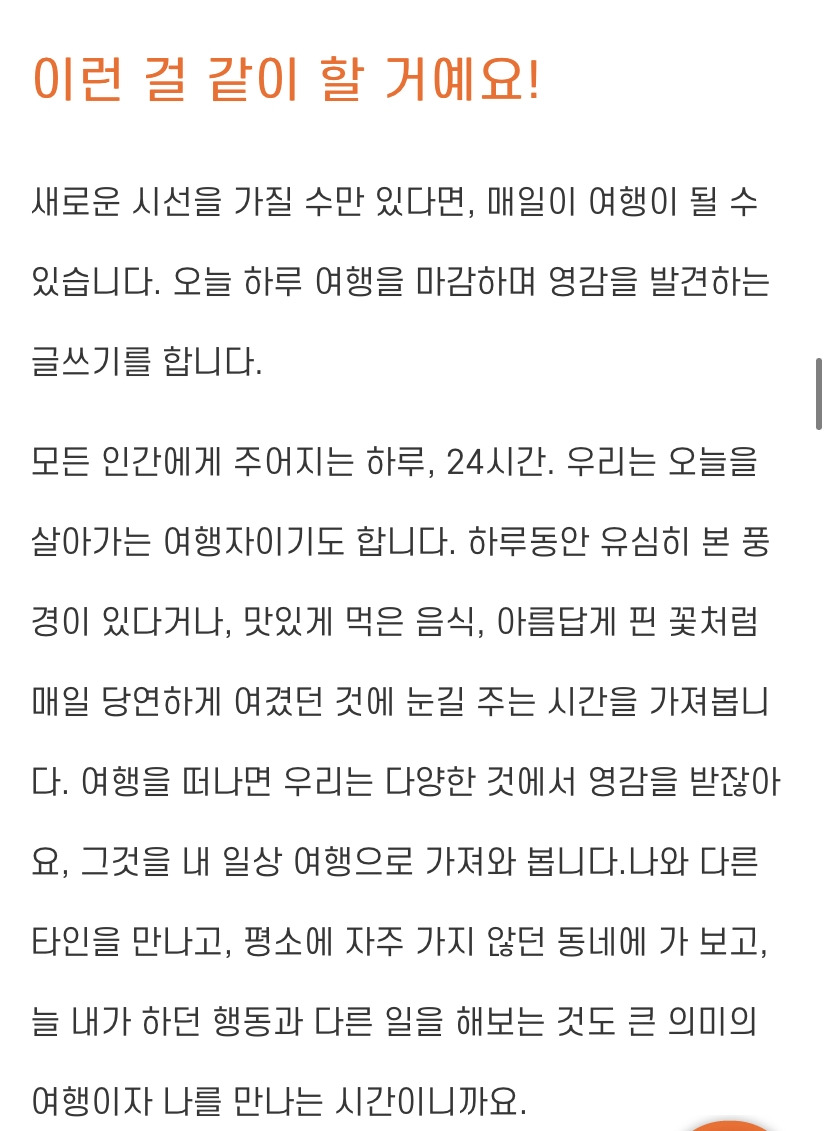 여기에 특히 글쓰기 관련 리추얼들이 많았던 게 생각났다. 아니나 다를까, 제목부터 확 와닿는 '일상 여행 x영감 글쓰기'라는 주제의 프로그램이 마침 신청기간이었다. 7만 원이라는 돈에 잠시 멈칫했지만 '변화는 항상 새로운 환경에 나를 노출했을 때 찾아온다'라는 말이 떠올라 일단 질렀다. 정체된 글쓰기 습관에 활력을 불어넣어 줄 만한 경험이 될 것 같은 느낌이 들었다. 무엇보다도 아직까지 스마트폰에 시선을 자주 뺏기는 나에게 '일상 여행, 일상 관찰'이 꼭 필요한 시점이었다. 그래, 하루에 커피 한 잔 씩만 덜 사 먹으면 되지.