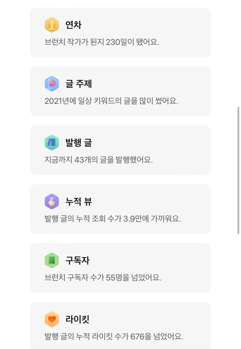 브런치 작가가 된 지 230일이 지났다. 그동안 나름의 주제를 잡아 생각을 덧붙여 43개의 글을 썼다. 내 글을 얼마나 읽어주실지는 모르겠지만 그래도 홍보 없이 55명의 구독자가 생겼다. 작년 이맘때 2020년 12월 말쯤, 글쓰기를 사이드 프로젝트로 삼고 목표를 세 가지 세웠었다. 그중 하나가 오픈 플랫폼, 특히 브런치에 글을 올리는 것이었는데 이 목표를 이뤘다는 것이 제일 뿌듯하다.