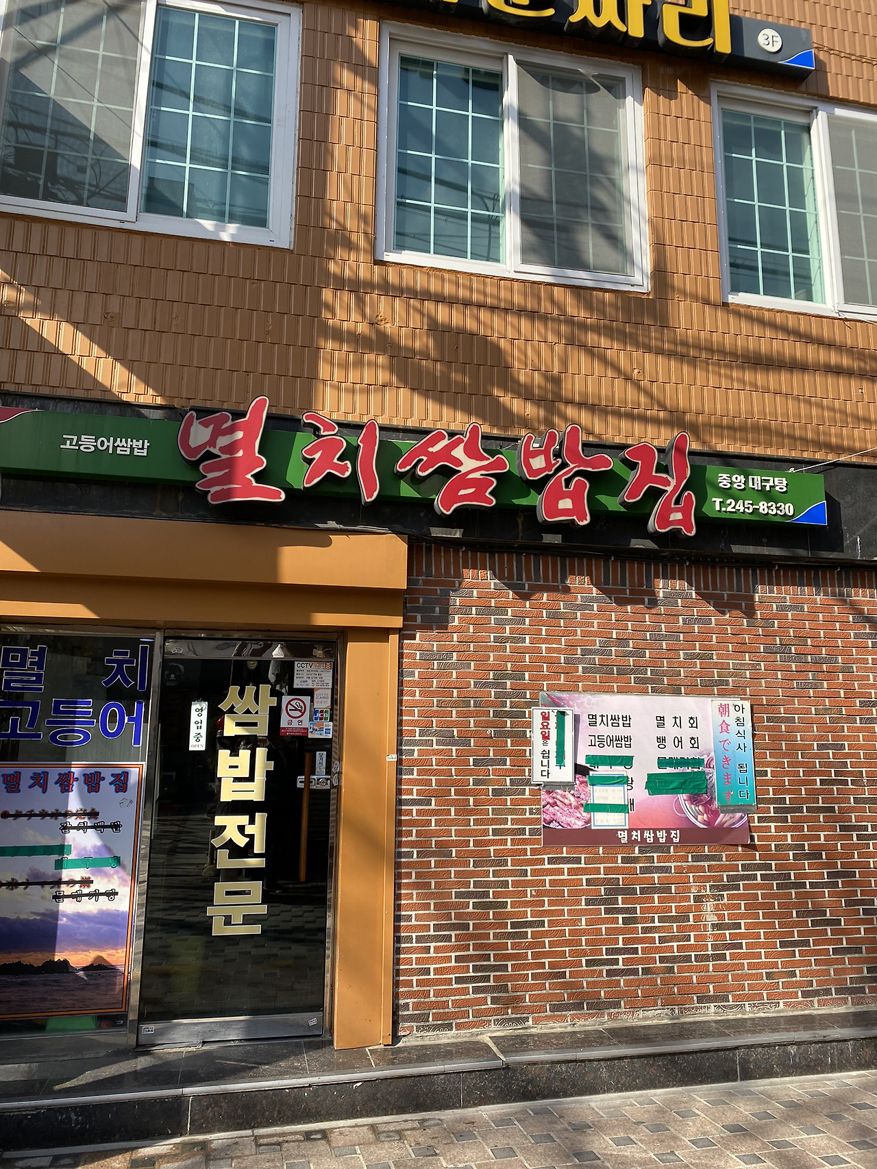 체크아웃 후 짐을 숙소에 맡기고, 걷는 3일 차 여행을 시작했다. 우선 우리가 머물렀던 중앙동 일대를 걸었다. 광안리나 해운대가 부산의 핵심지역으로 떠오르며 자연스럽게 구도심이자 과거의 영광이 되어버린 중앙동. 왠지 아침도 이 동네에서 오랫동안 장사를 하신 식당에서 먹어보고 싶었다. 굿올데이즈 호텔 추천리스트를 참고해 우리가 선택한 집은 ‘멸치쌈밥집’ - 이게 진짜 식당 이름이다. 예전엔 '중앙 대구탕'이라는 이름이었던 것 같다.