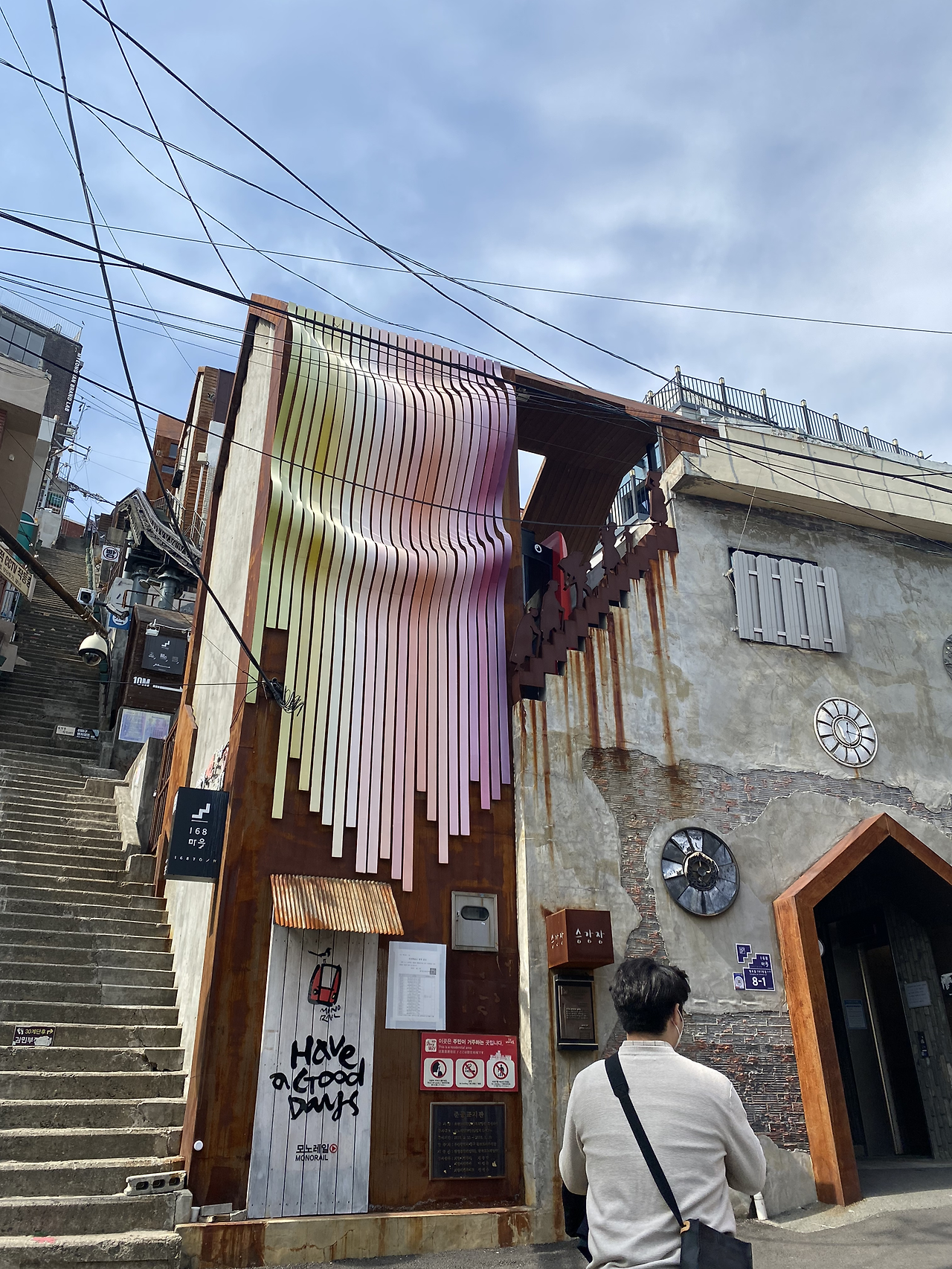 커피로 에너지 충전을 한 뒤, 우리는 다시 초량동 이야기길을 향해 걸었다. 이 동네는 부산의 근현대 역사화 문화가 고스란히 녹아있는 공간이다. 많은 관광객들이 찾아오긴 하지만, 지역주민들의 삶이 고스란히 녹아있는 곳이기도 했다. 걸으며 볼 수 있는 과거부터 이어온 현재의 흔적들이 꽤 많았다. 부산 최초의 교회, 90년 된 초등학교, 차이나 타운, 최초 서양식 병원이 탈바꿈한 카페, 칸칸이 삶의 애환이 서린 168계단 등등.. 특히 168계단은 경사가 어마어마해서 동네 주민들을 위해 모노레일까지 설치되어 있는데 이걸 타러 오는 여행자들도 많다고 한다. 모노레일 운영도 초량동 동네 어르신분들께서 직접 하시는데, 모노레일을 기다리는 동안 짧게 그분들과 나눴던 대화들이 잔상처럼 남아있다.