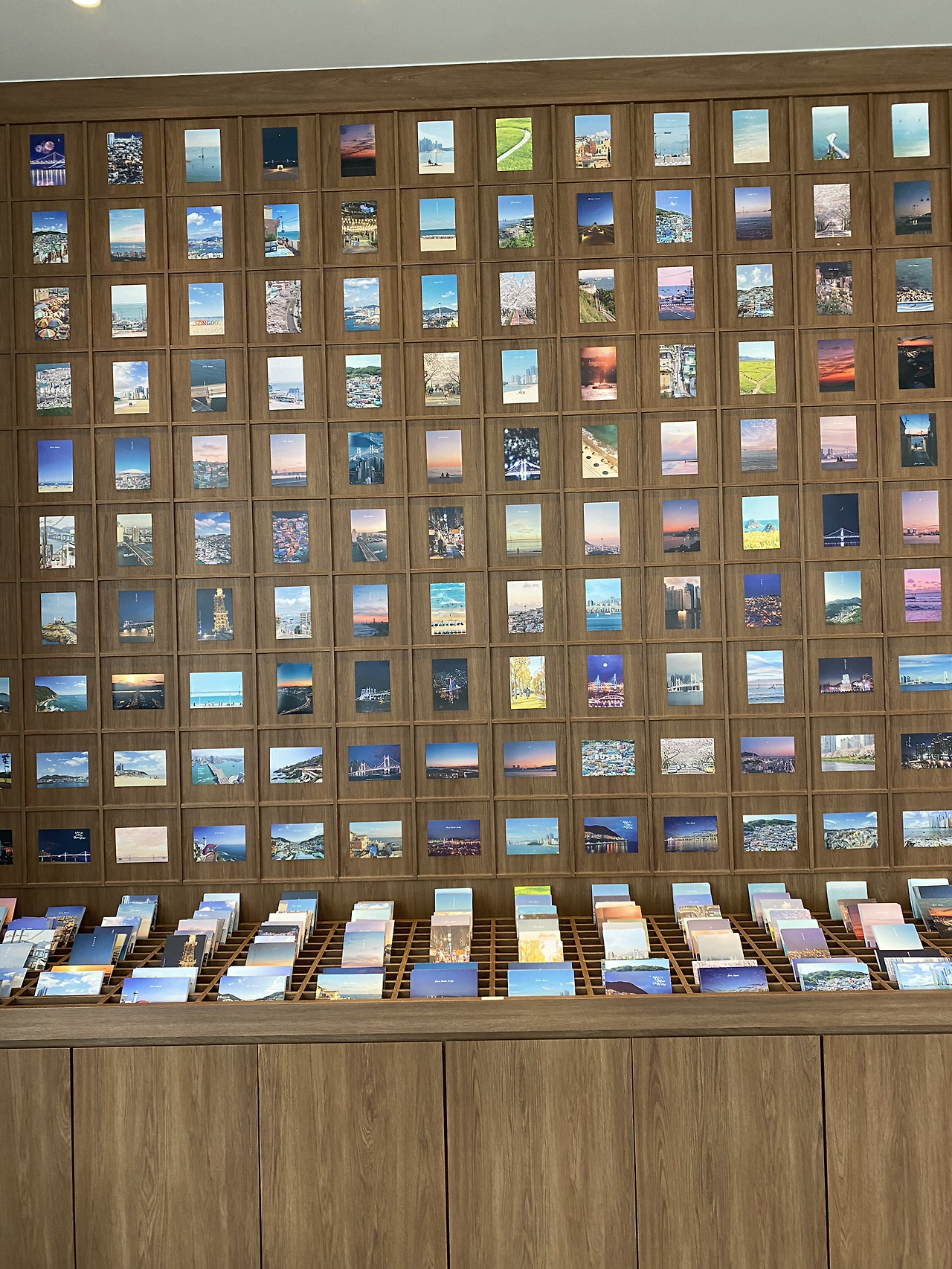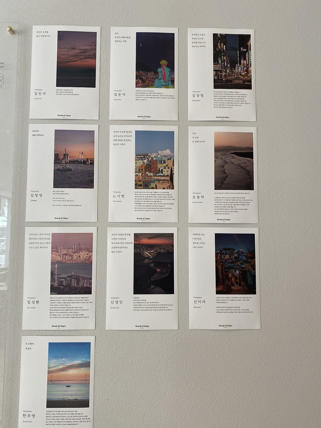 공원을 내려와 광복동 일대를 지나 다시 우리 숙소의 카페로 돌아와 잠시 카페인을 수혈했다. 2박을 했지만, 처음 들러보는 굿올데이즈 카페였는데 정말 부산을 아끼는 사람들이 부산을 트렌디하게 이미지화해 놓은 공간 같았다. 카페 한쪽 벽면을 빼곡히 매운 부산 풍경의 엽서들은, 부산을 사랑하는 여러 작가들이 만들어낸 사진작품이라고 한다. 역시 애정의 필터를 끼워 찍은 사진은 결과물자체가 다르다.