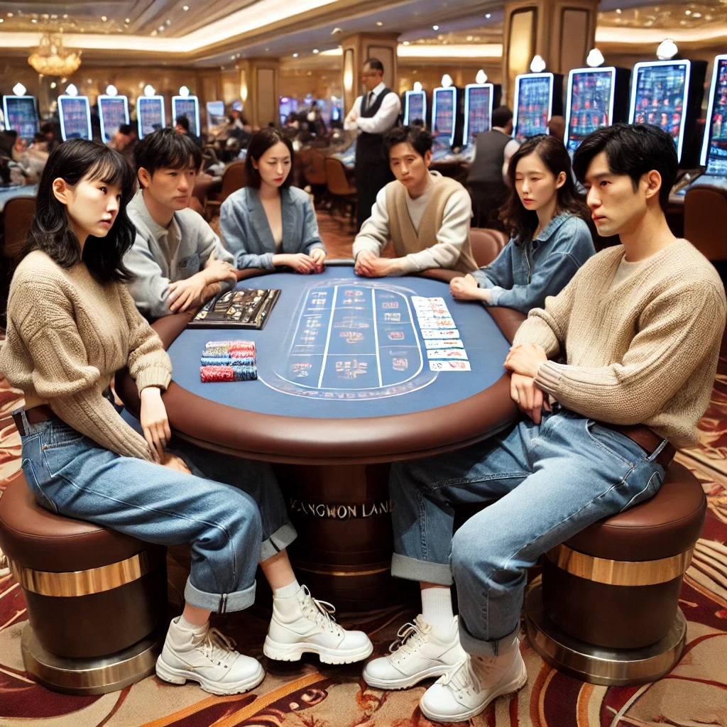 JJ와 SS 부부는 카지노에 도착했다. 긴장된 얼굴로 서로를 바라본 뒤, 천천히 안으로 들어갔다. 화려한 조명이 비추는 테이블들이 그들을 환영했다. 딜러는 부드러운 미소로 그들을 맞이하며 말했다.