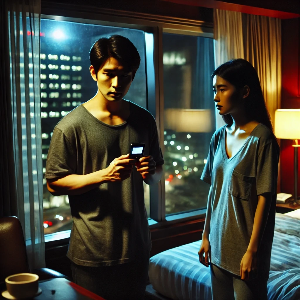 엘리베이터 문이 열리고, SS와 JJ는 호텔의 고급스러운 복도를 따라 걸어갔다. 1507호 앞에 도착하자, 문이 자동으로 열렸다.