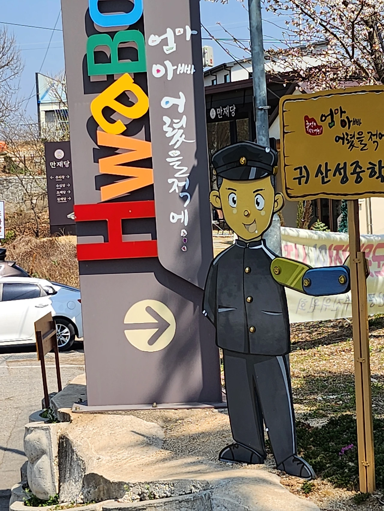 우리 세 고참에게 배당된 방은 두방향으로 널다란 창이 나 있고, 밖에는 산벚나무가 연붉은 꽃을 활짝 피우고 우리를 반긴다. 사람에게 길들여지고.다듬어진 도로양쪽에, 간격과 줄을맞 춰 가지런히 늘어선 벚나무와는 달리, 스스로(自) 그러하게(然) 다른 이웃과 더불어 자라서 곱게 꽃비운 네가 더욱 정겹고 이쁘구나.네가 만개한 때에 내가 찾아온거니, 아니면 내가 찾아오기를 기다렸다가 내가 오니까 피었니?