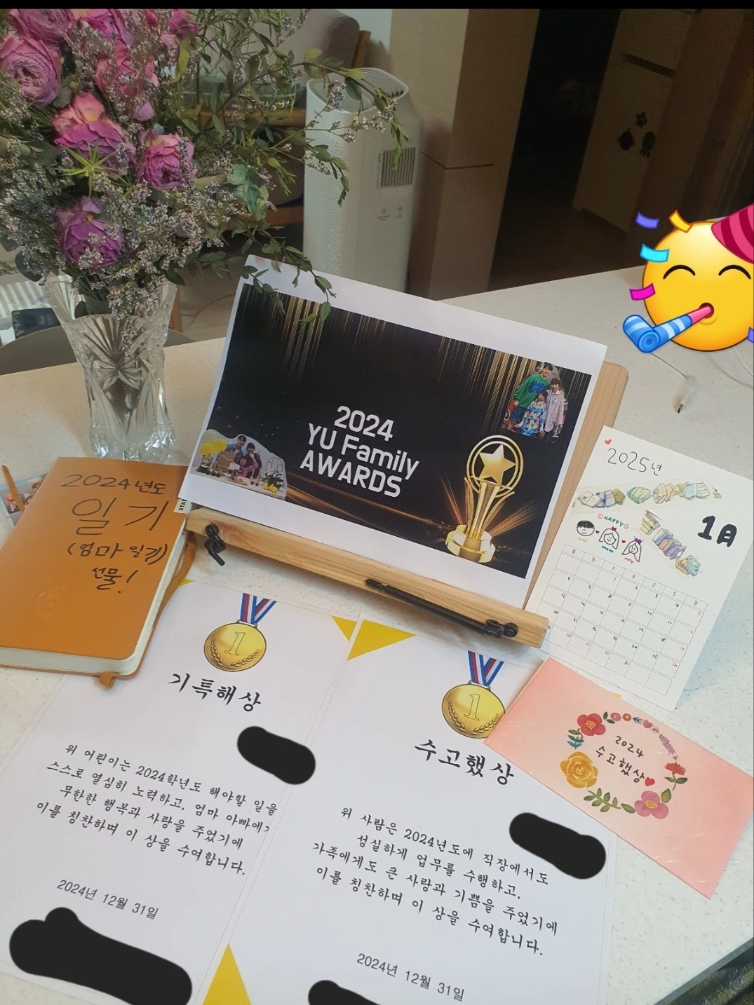 포스터를 완성하고 나면 상장 제작에 들어간다. 이번 어워즈의 상은 ‘기특해상’과 수고했상‘이다. 상장을 만들고 상품을 준비한다. 상품은 현금 만원과 아무 때나 쿠폰 3장(숙제 및 잔소리 해방권, 안마 쿠폰, 소원 1가지 쿠폰)이다. 딸에게는 보너스 상품이 있다. 일년 동안 쓴 나의 육아일기장이다. 우리는 그 일기장을 보면서 한해를 되짚어본다. 상장과 상품을 정성스럽게 포장하는 것으로 사전 행사 준비를 완료한다.