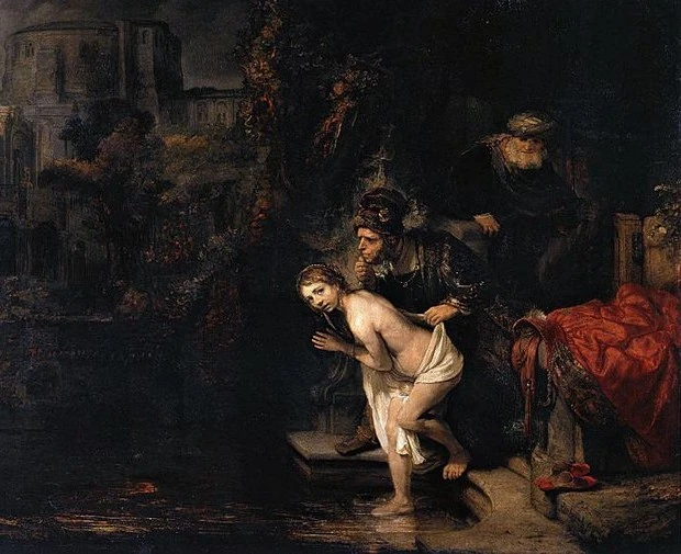 렘브란트의〈목욕하는 수산나>(Susanna and the Elders)는 단순한 누드화가 아니라, 구약(외경) 속 인물의 순결과 이에 대한 위협적인 상황을 묘사한 것으로, 특유의 빛과 어둠을 조화하는 기법으로 그림 속 인물의 내면과 숨소리가 생생히 느껴질 만큼 정교하게 그려낸 걸작이다.