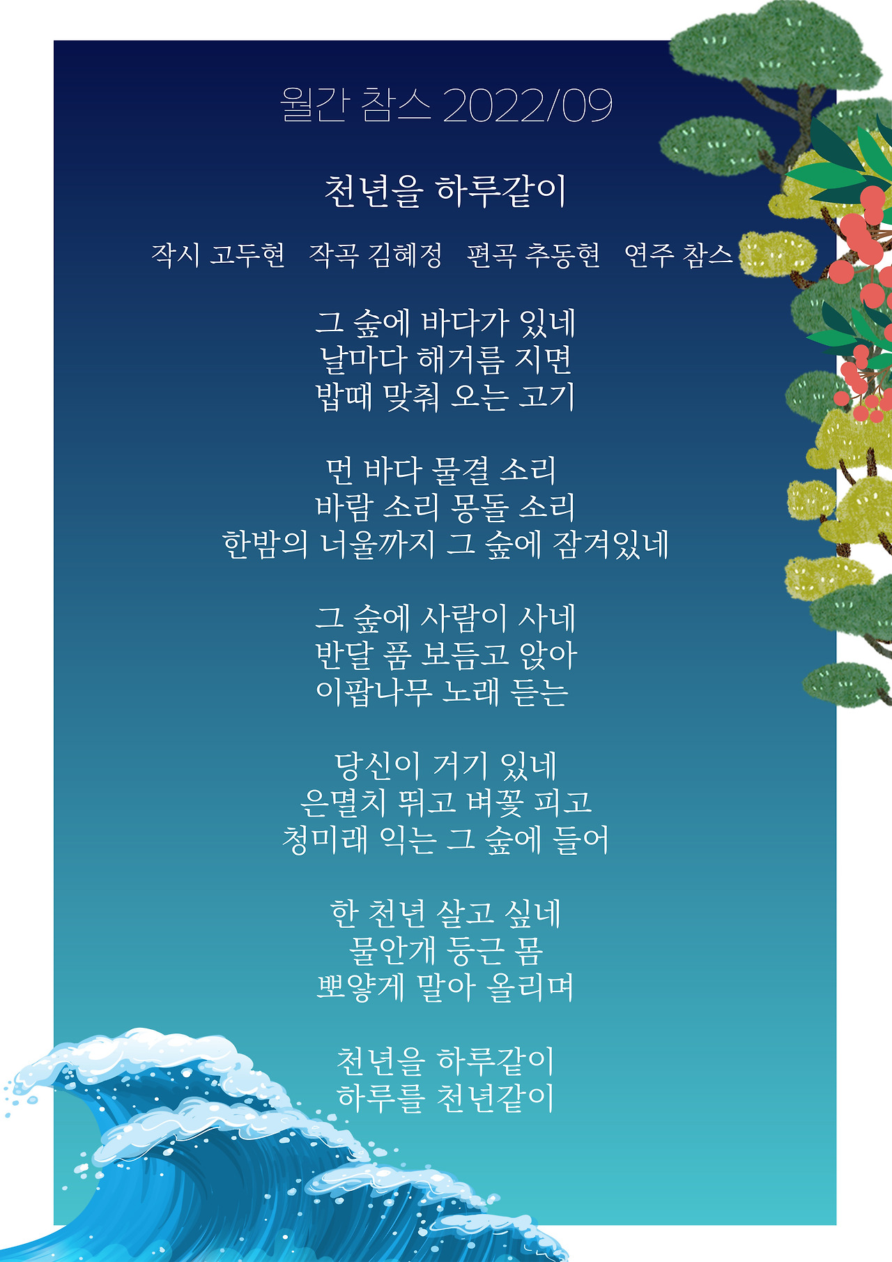 곡을 쓸 때에는 당신이 누군지 몰랐습니다. 꼭 뭐 알아야 하나요. 연정을 품었던 누구였나 보다 하고 막연이 짐작만 했지, 그게 누구일 것이라고는 알기가 힘들잖아요. 시적 상상을 하며 읽었던 시에서 남해바다, 그 굽이치는 파도가 떠올랐습니다. 그 파도가 자꾸 닿으려고 하는 이팝나무 향이 가득한 숲은 또 어떻고요. 고두현 시인님이 풀어놓은 시어들이 실감 나게 살아나 머릿속, 또 가슴속에서 푸른 바다와 초록 숲이 되어 끌어올려주는 멜로디를 오선 노트에 담았습니다. 오늘도, 세상도, 다 잊고 싶을 때 고즈넉이 앉아 쉬고 싶은 남해바다에 그런 나와 함께 있어줄 누군가를 떠올리며 바람소리 몽돌소리를 오선지 위에 박았습니다. 그러니 이건 제가 쓴 곡이라기보다 이미 시가 멜로디를 가졌다고 할 밖에요. 한 시간이 조금 넘었으려나. 곡이 뚝딱 나왔는데 아니 글쎄 제 곡이라 민망하지만 민망함을 넘어서는 아름다움이 담겼습니다. 역시나 시의 힘이겠지요. 그리고 나중에 시인의 이야기를 통해 알게 된 '당신'의 존재! 눈물이 그렁 맺히던 이야기에 더 애틋한 이 노래.