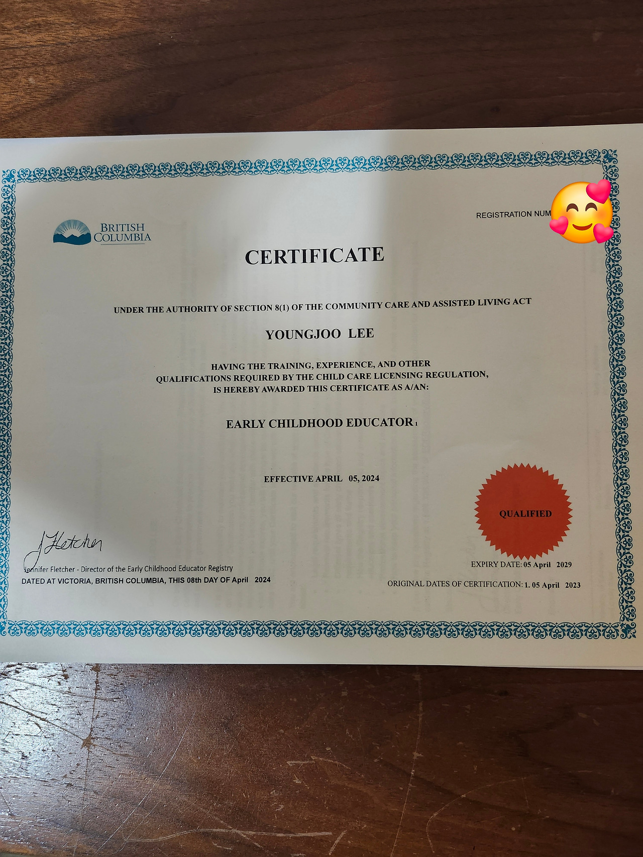그리고 4월 31일 BC주 ECE Basic 자격증을 취득하였다.