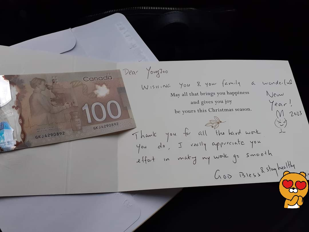 선생님은 너무나 서운해하시며 갑자기 지갑을 꺼내셨다. 지갑에 있던 현금 전부인 몇 백 불을 꺼내주시며 그동안 잘 도와줘서 정말 고마웠다고 말씀하셨다. 크리스마스 때도 카드와 함께 금일봉을 주시던 선생님이시다.