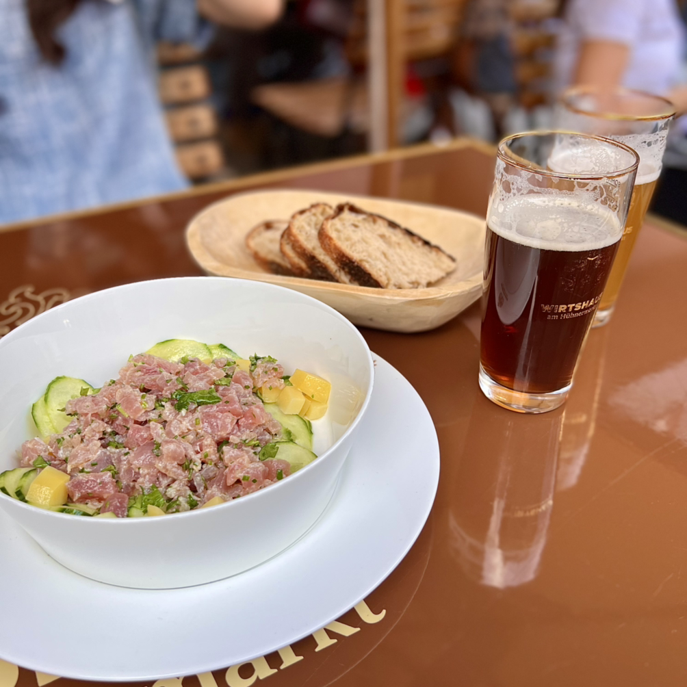 세시간쯤 지났을까, 어찌나 걸었는지 또다시 허기가 진다. 이번에는 중앙쪽에서 살짝 벗어나 구시가쪽으로 걸음을 옮긴다. 그래도 독일에 왔는데, 생맥주 한잔은 마셔야지 않겠냐는 선배의 말에 보고싶은 아빠의 얼굴이 아른아른하다. 우리 아빠, 참 맥주 좋아하는데. 아빠가 좋아하는걸 나만 한다고 생각하니 슬금 찾아오는 미안함. 살짝 처질뻔했으나 “Enjoy!(맛있게 드세요!)” 웨이터의 우렁찬 목소리와 표정에 툭하고 턴다. 저녁은 추천받은 맥주 두잔과 오늘의 메뉴인 참치샐러드. 가볍고 상큼한 풍미가 좋다.