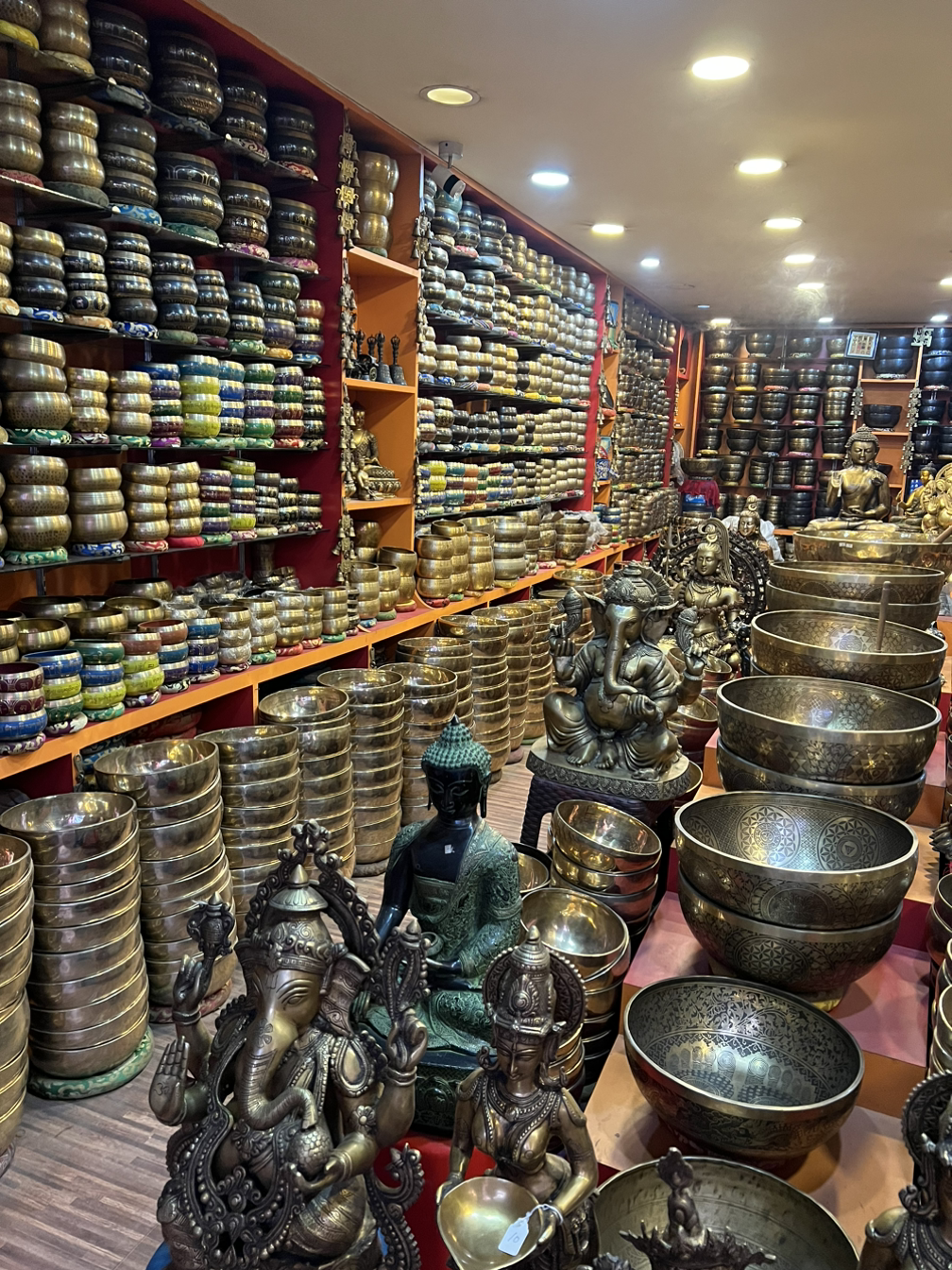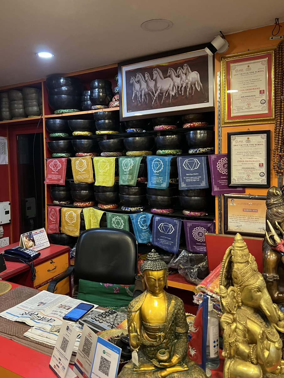 한국으로 꽤나 긴 겨울 휴가를 들어가기 직전이기에 가족들과 친구들에게 줄 기념품을 살 계획이다. 발 닿는대로 여러 상점을 둘러보는데 싱잉볼(문질렀을 때 신비한 소리를 내는 그릇, 주로 명상에 쓰인다)을 잔뜩 쌓아둔 곳에 눈이 간다. 눈길을 끌었으면 또 들어가줘야지. 지하로 살짝 경사진 입구를 따라 내려가니 건장해보이는 한 할아버지가 머리를 질끈 묶고 투박하지만 깔끔한 전통 복장에 양손과 목에 염주를 주렁주렁 메고 있다. 손님이 오는둥 마는둥 전혀 신경도 쓰지 않고 자리에 가만히 앉아 무언가에 몰두한 모습이다. 오히려 편하게 구경할 수 있어 좋아.