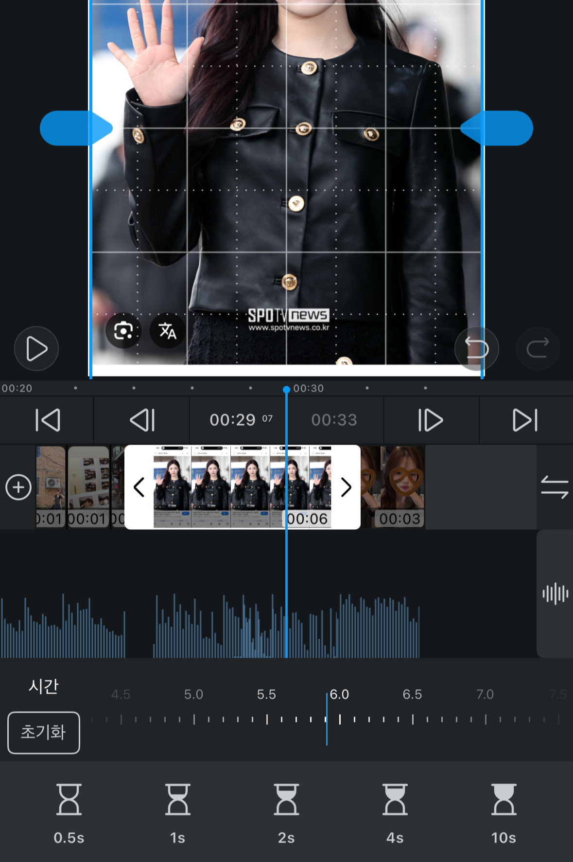 하지만 한 가지 아쉬운 점도 있었습니다. 눈금선을 기준으로 타이밍 조절이 가능하긴 하지만, 현재 내가 조정 중인 정확한 시간값(예: 5.9초)이 실시간으로 표시되지 않는 점은 아쉬웠습니다. 슬라이드를 살짝만 움직여도 타이밍이 꽤 달라지기 때문에, 정확한 시간값을 상단에 작게라도 실시간으로 보여주는 인터페이스가 있었다면 더 정밀한 편집이 가능했을 것 같아요.