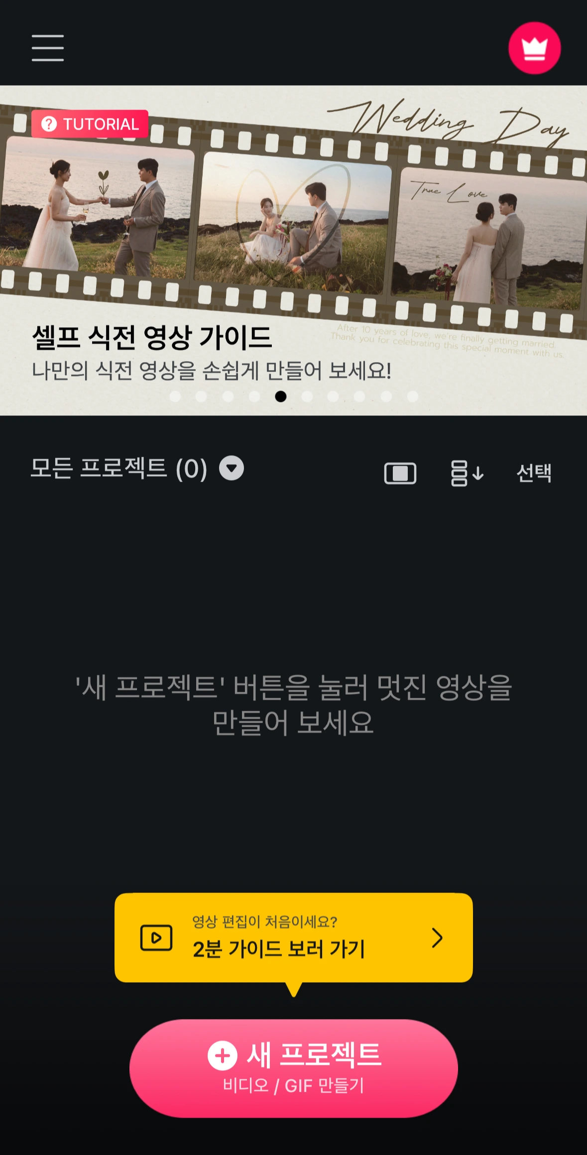 VLLO는 메인 화면에서 “2분 가이드 보러 가기”를 바로 보여줍니다.