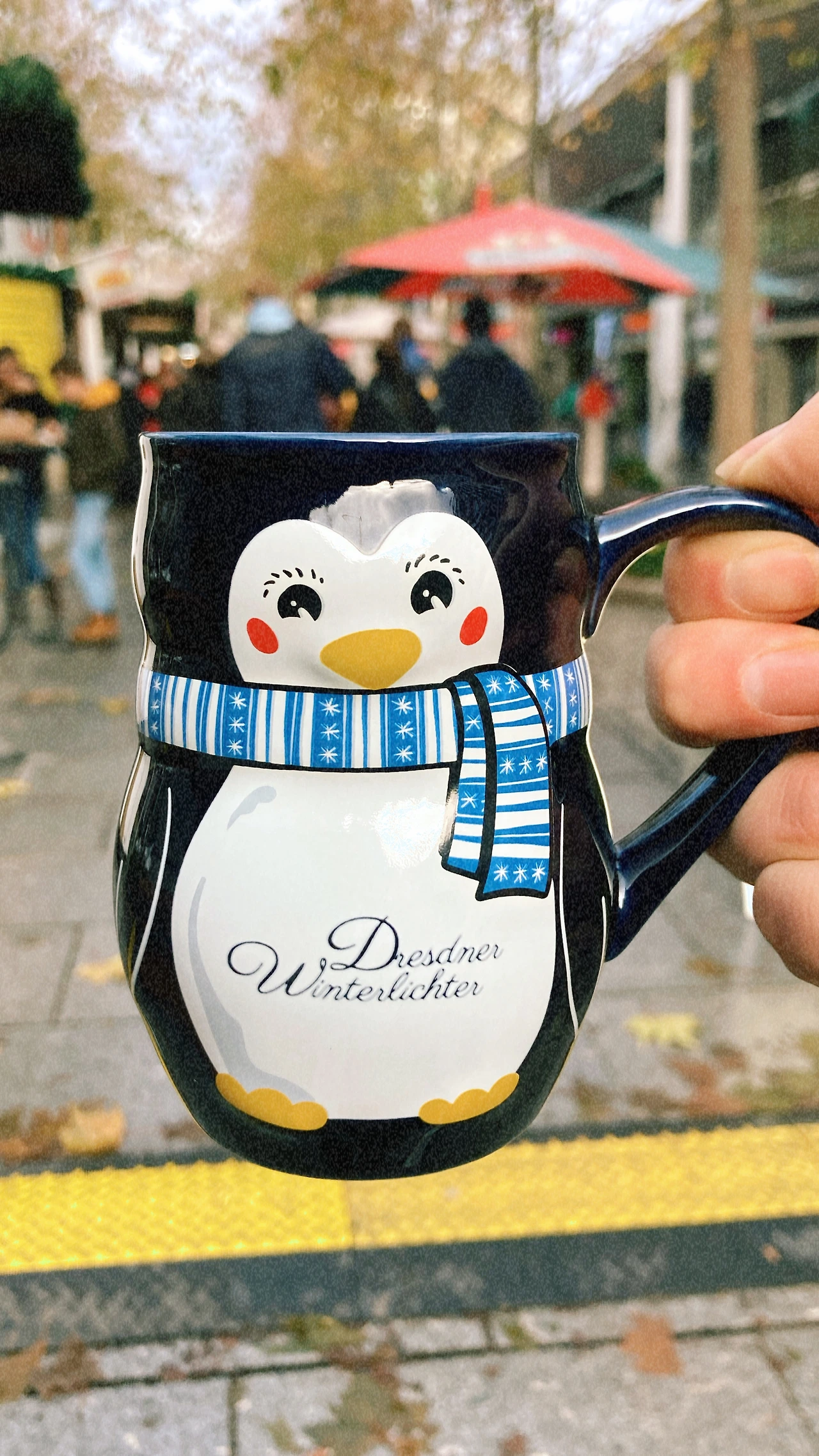 역을 나와, 크리스마스 마켓이 있는 방향으로 길을 걷다 보면, 그냥 계속 마켓이 쉴 새 없이 나온다. 드레스덴의 맛집을 찾아볼 필요도 없이, 맛있어 보이는 음식들을 골라 먹었다. 이때 얻은 드레스덴의 펭귄 글루와인 컵은, 아직도 꽤나 애정하는 컵이다.