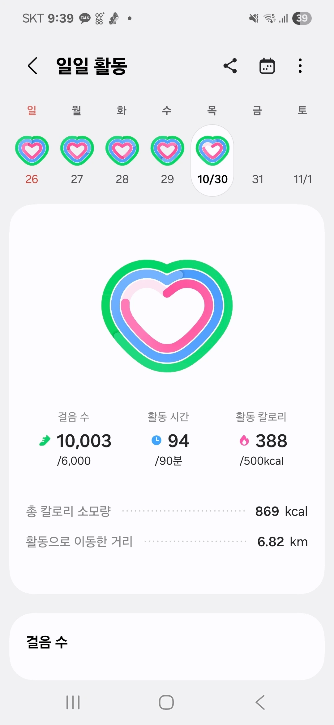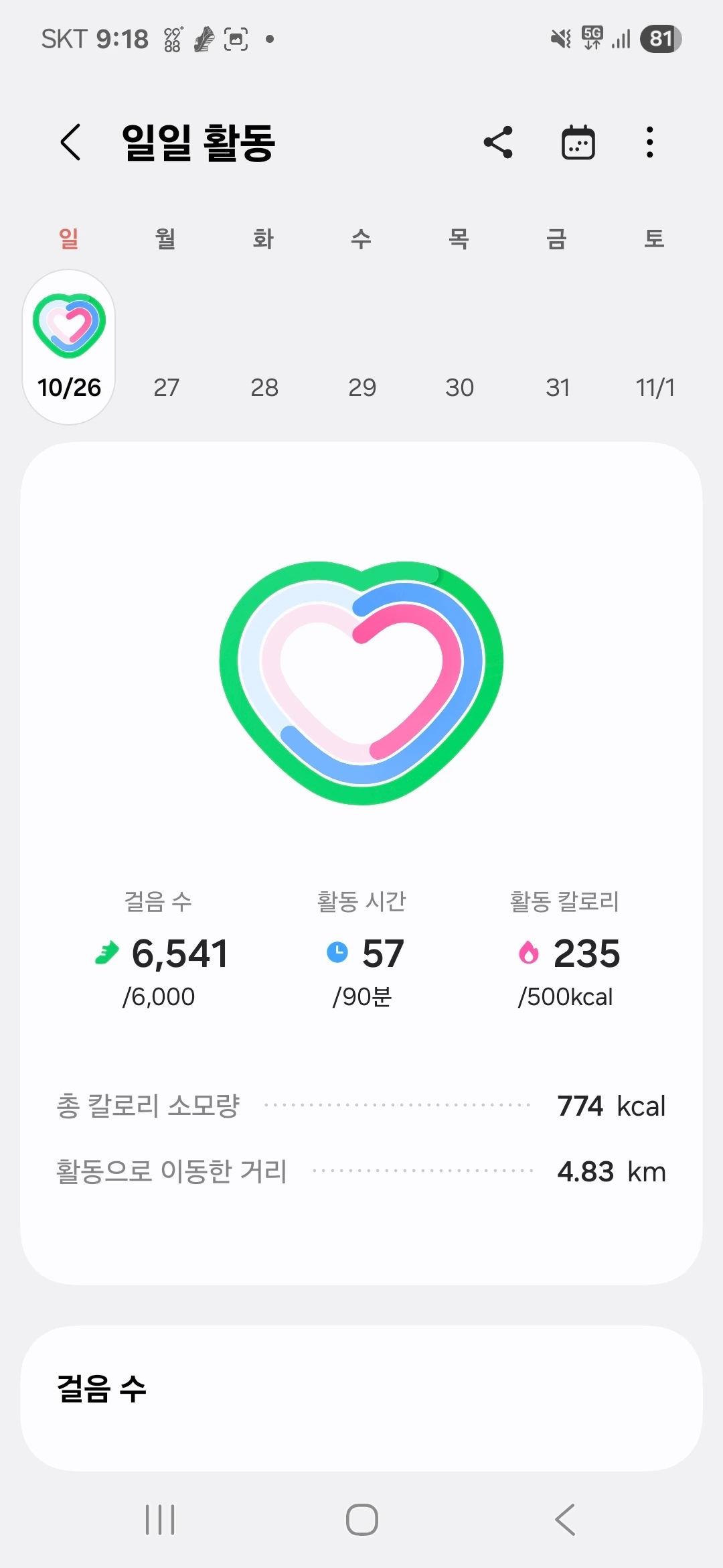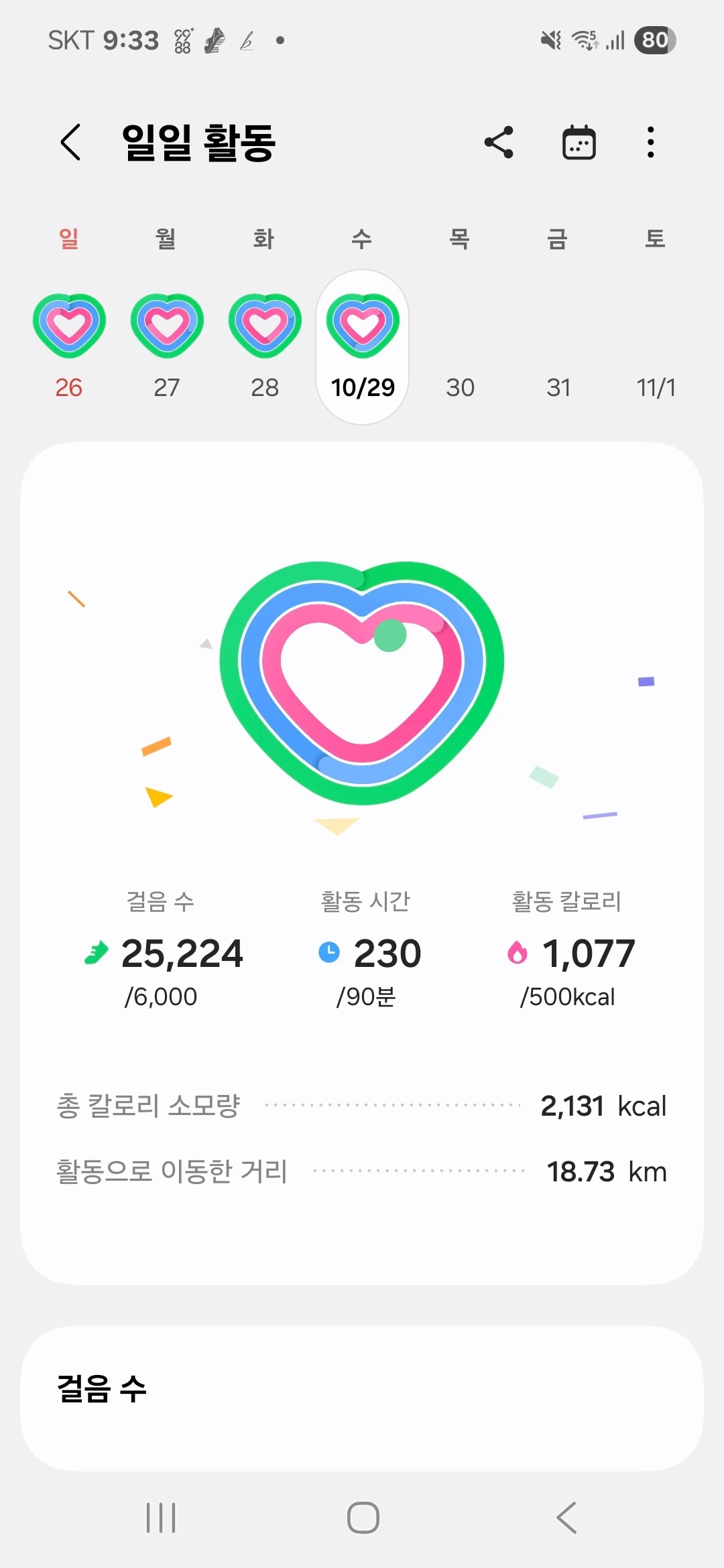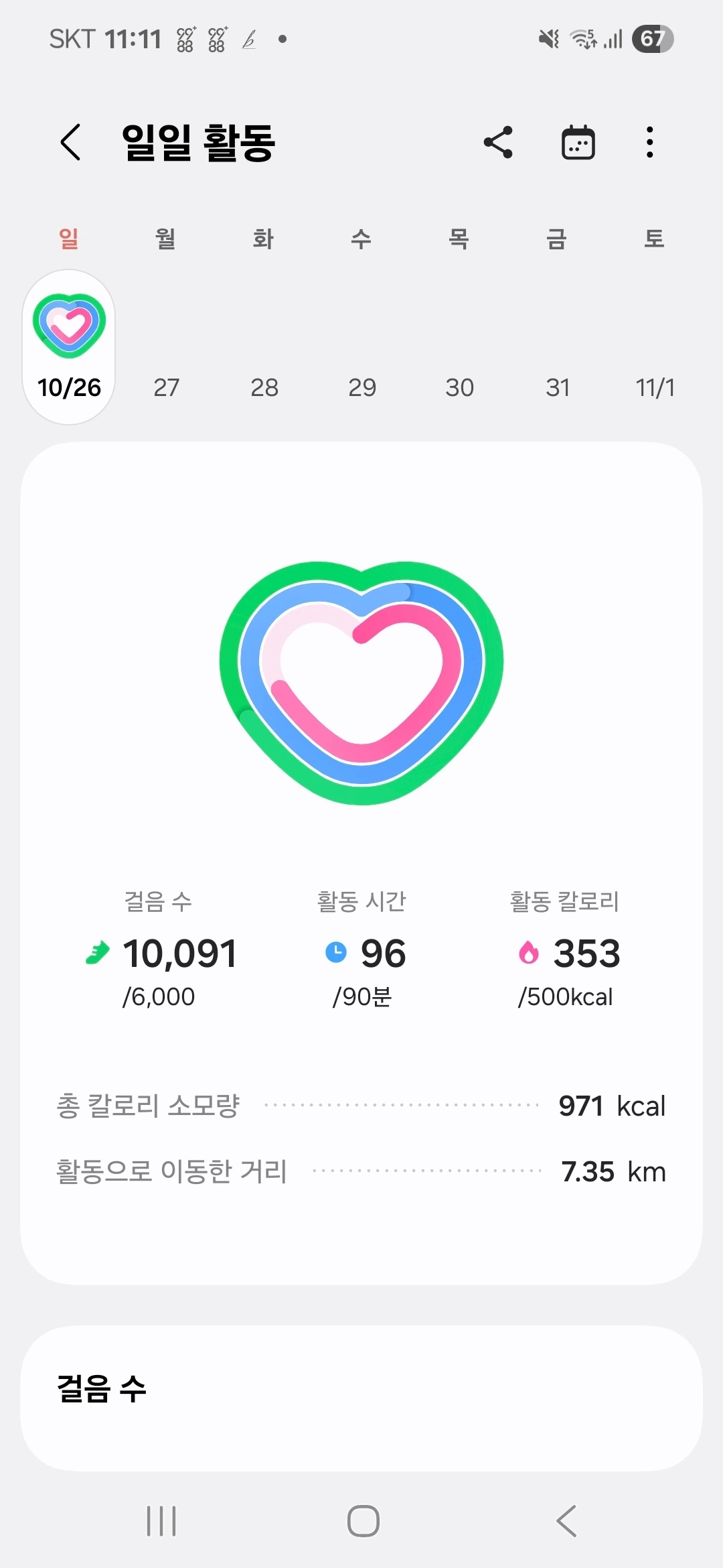 - 공원에서 빠른 걷기 및 러닝 30분, 스쾃 30개, 스트레칭 포함 10분 운동 40분 완료