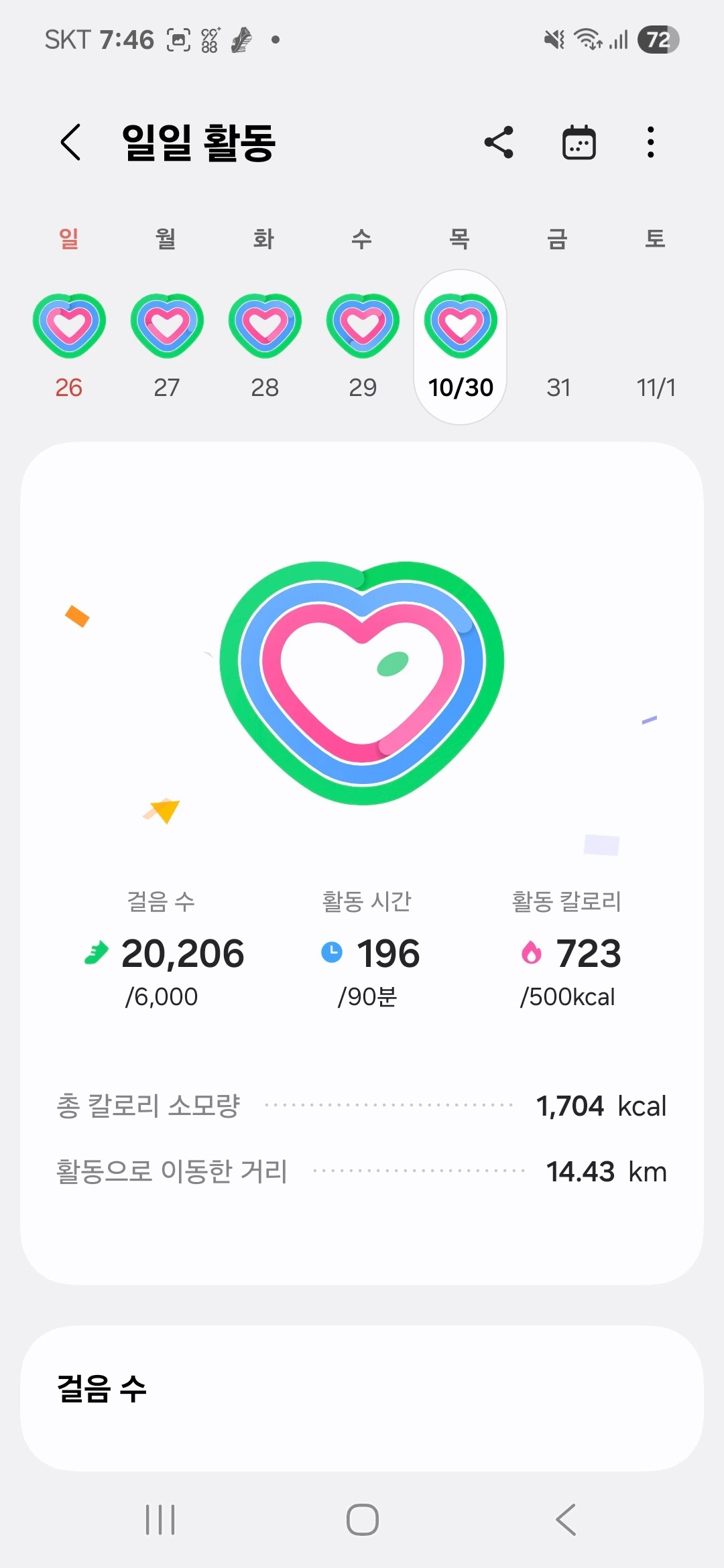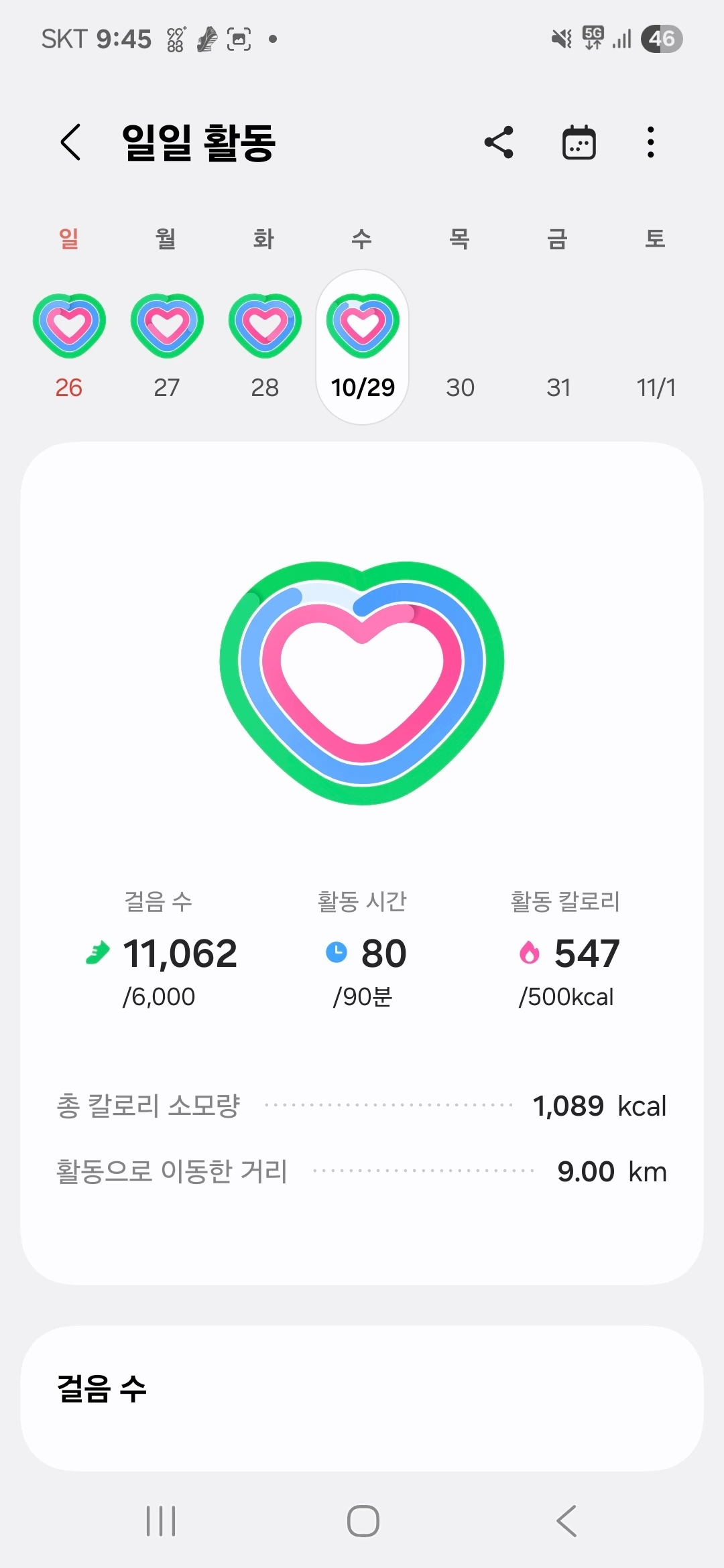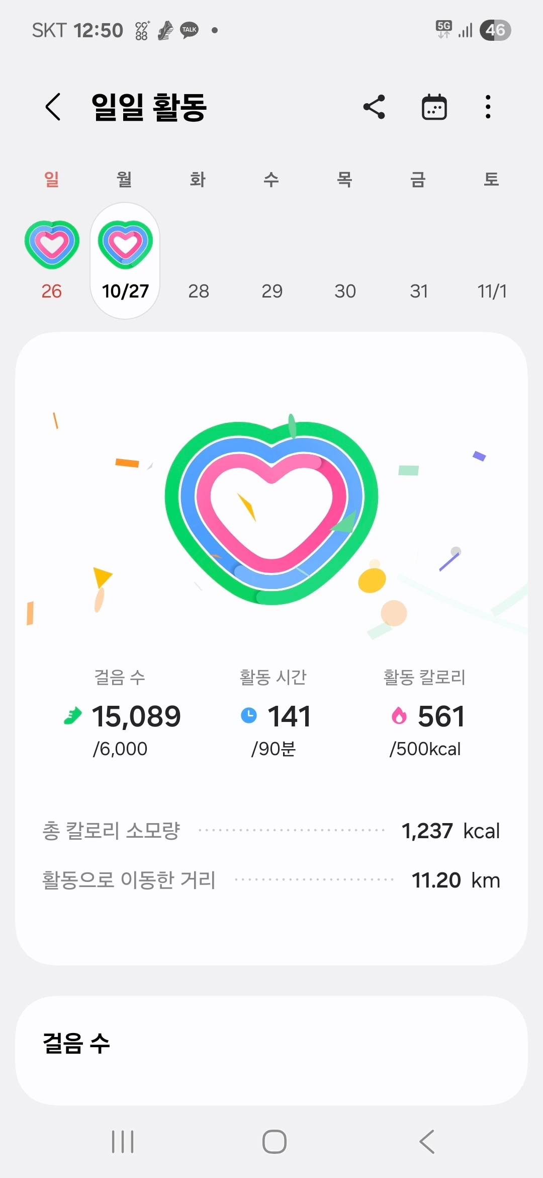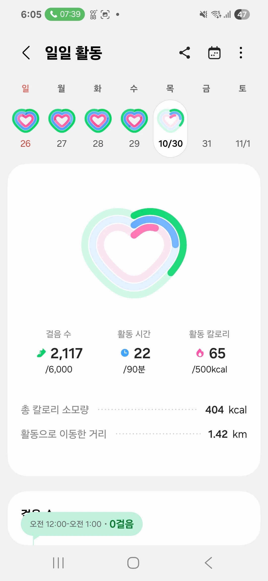 - 공원에서 빠른 걷기 및 러닝 30분, 스쾃 30개, 스트레칭 포함 10분 운동 40분 완료