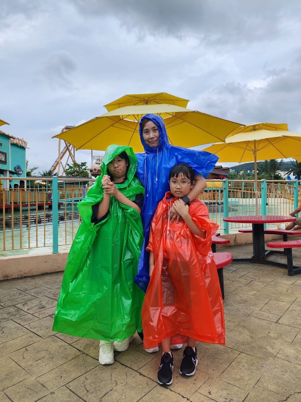 아이들과 나하고만 각자 사이즈에 맞는 우비를 사서 입고 선머린 스플레쉬를 탑승했는데 배가 경사진 곳을 내려가면서 물에 확 튀기다 보니 옷이 다 젖어서 물에 빠진 생쥐꼴이 되었다.